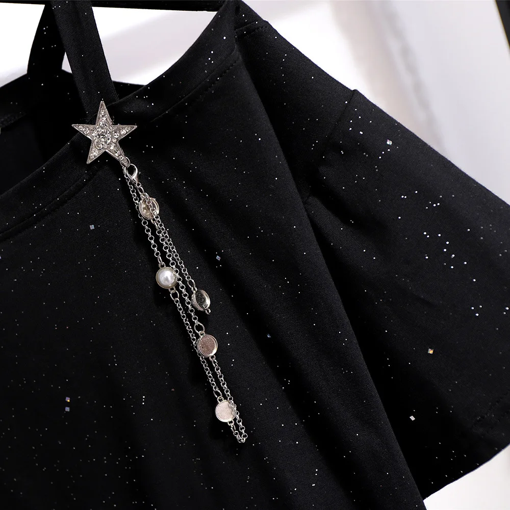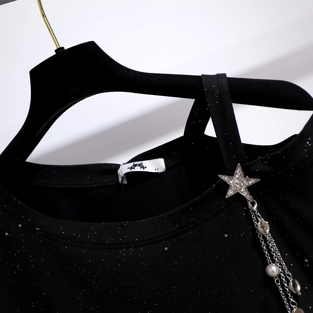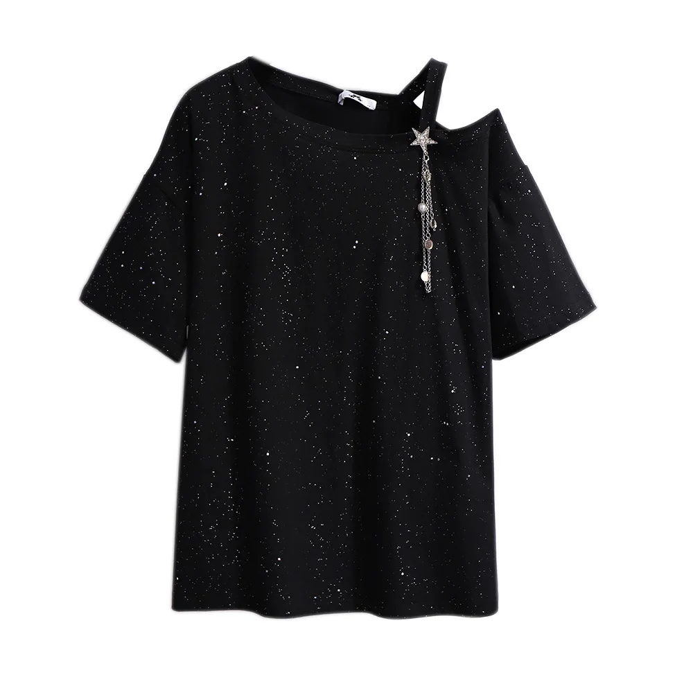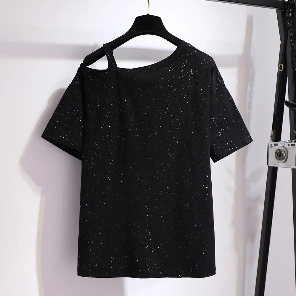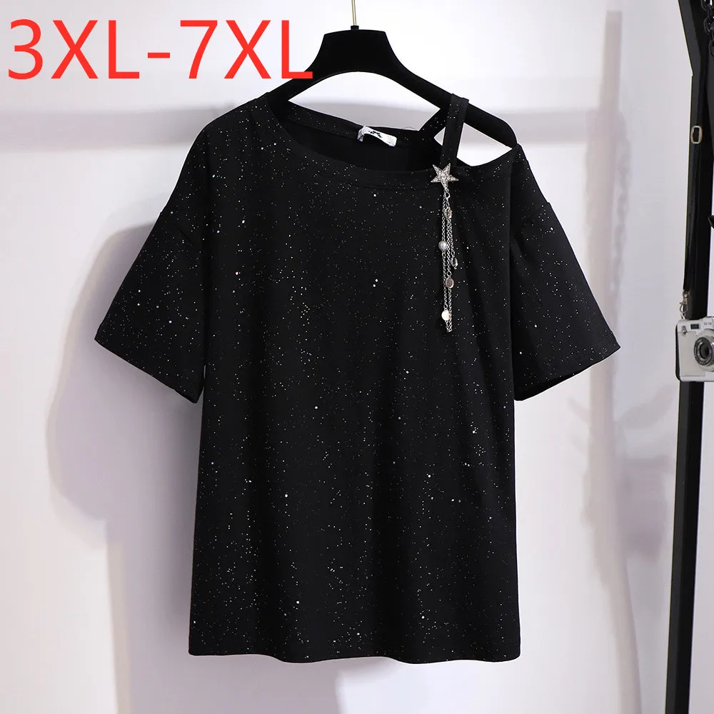 Женская хлопковая футболка, черная свободная футболка с коротким рукавом, открытыми плечами и блестками, лето 2021, размера плюс, 7XL