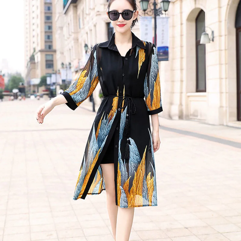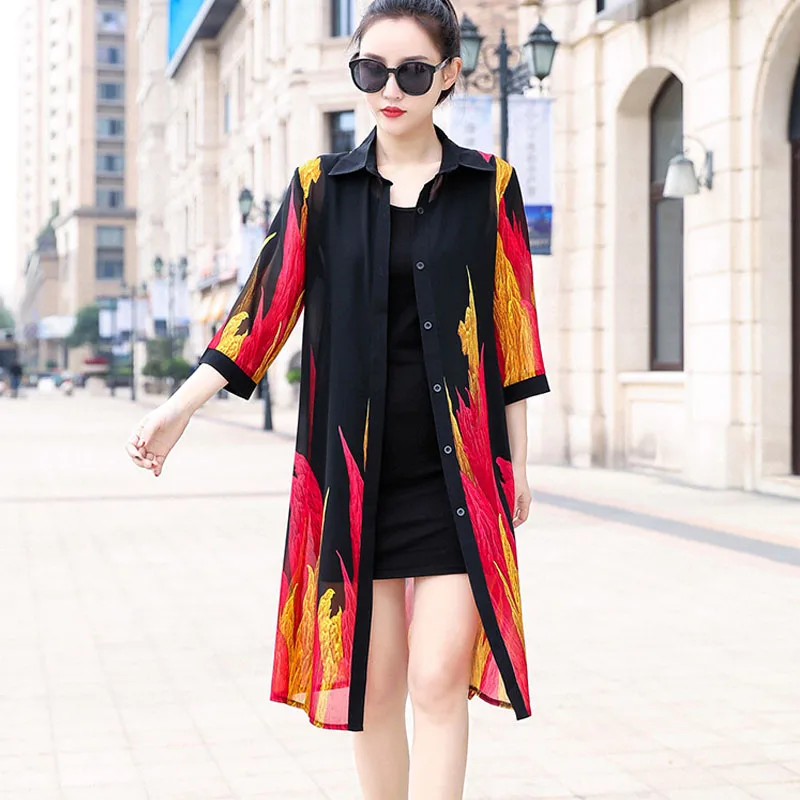 Блузка Женская Длинная с коротким рукавом, свободная блузка с цветочным принтом, супертонкий шифоновый кардиган с цветочным принтом, 9122 50, для лета