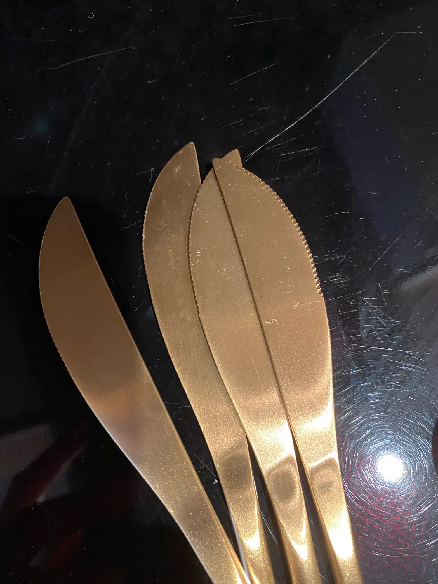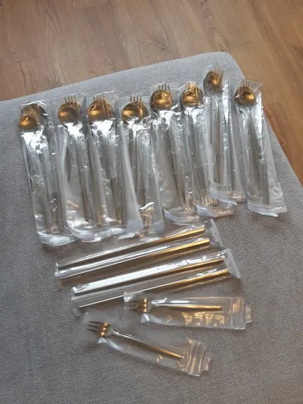 Качество ужасное, глупо, конечно, было ожидать чего-то стоящего за эти деньги, но даже этих денег пришедшие приборы не стоят. Кушать ими будет невозможно и опасно, края очень острые, необработанные. Сожалею о данной покупке, хотя пришли очень быстро и упакованы хорошо.