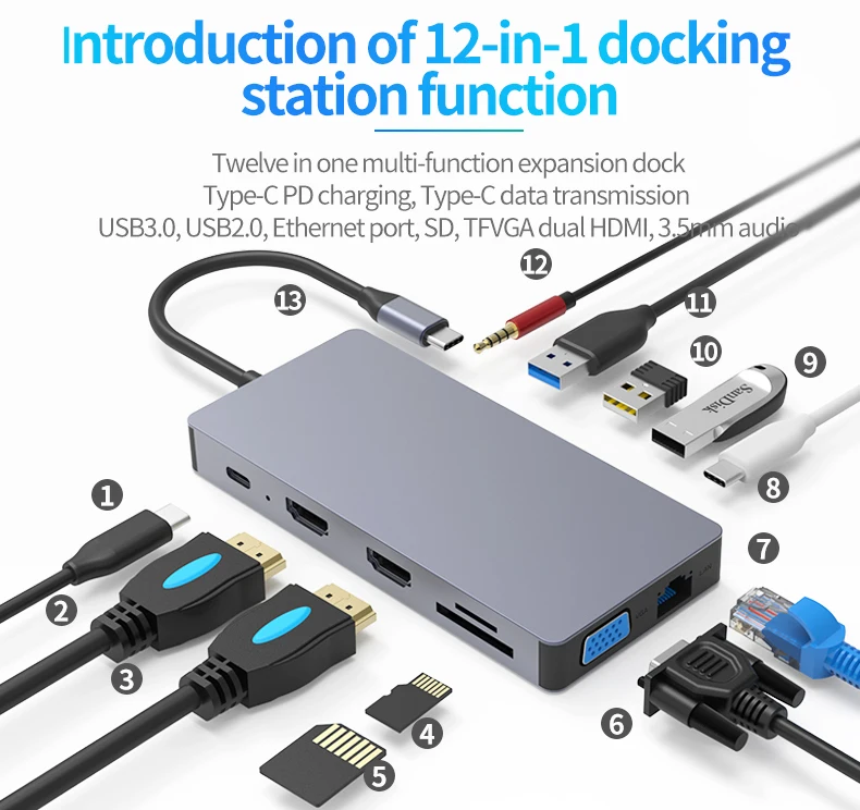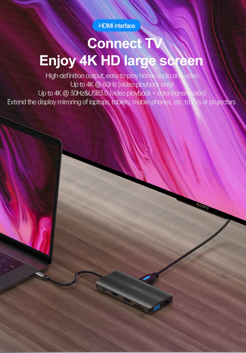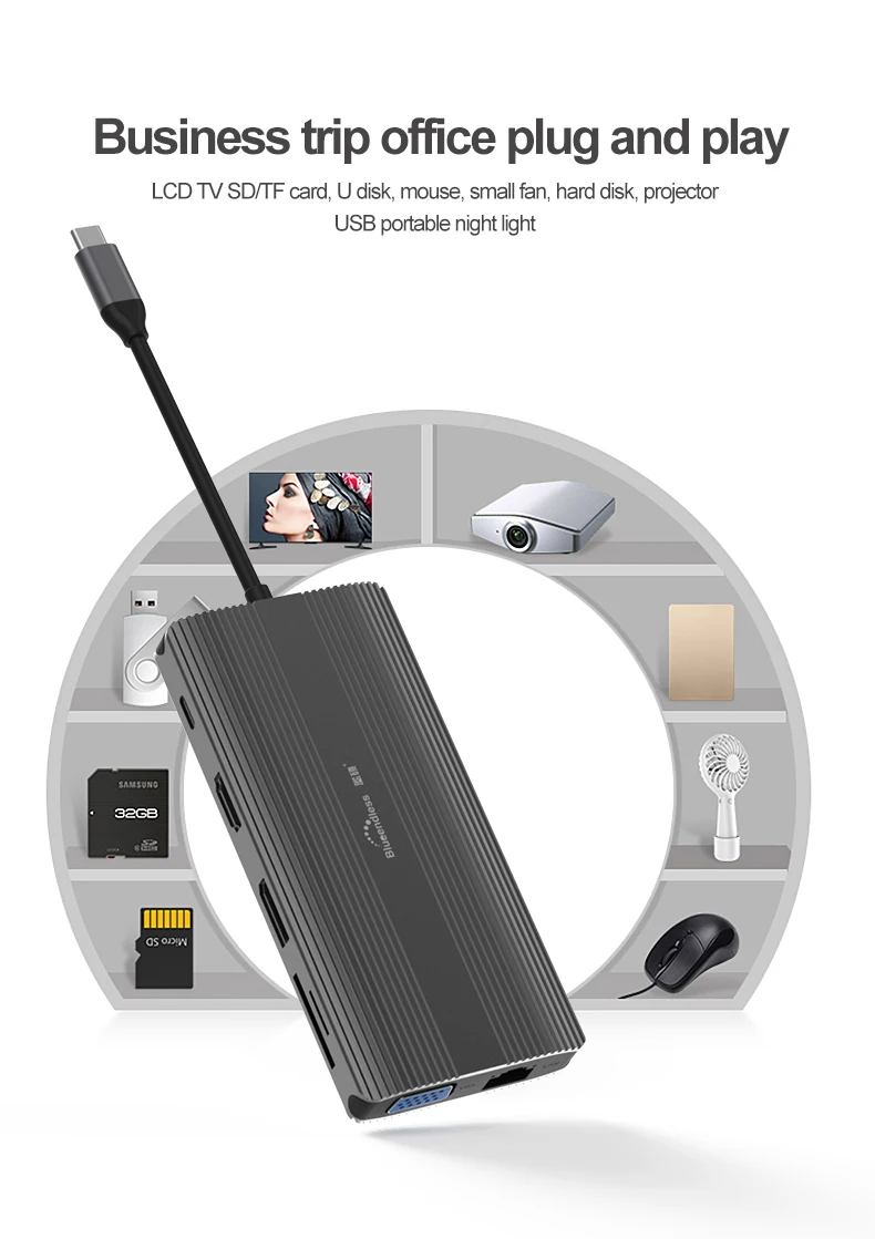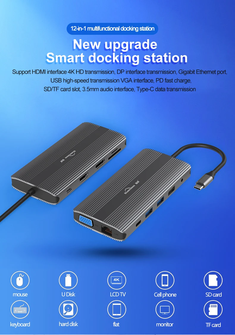 (1) HP1201 :12-в-1:DP + HDMI(4K @ 60 Гц) + VGA + RJ45 + SD/TF + 2 * USB3.0 + USB2.0 + PD(100 Вт) + Type-C + 3,5 мм audio Mond(2) HD1201 : 12-в-1:2 * HDMI + VGA + RJ45 + SD/TF + 2 * USB3.0 + USB2.0 + PD + Type-C + 3,5 мм audio Mond(3)HC1101C : 11-в-1:2 * HDMI + VGA + RJ45 + SD/TF + 3 * USB3.0 + PD + 3,5 мм audio Mond(4)HC101C : 10-в-1:HDMI + VGA + RJ45 + SD/TF + 3 * USB3.0 + PD + 3,5 мм аудио(5) HC101A : 10-в-1:HDMI + VGA + RJ45 + SD/TF + 3 * USB3.0 + 3,5 мм аудио + PD USB-C Mond(6) концентратор 901 : 9-в-1:HDMI + RJ45 + SD/TF + 3 * USB3.0 + 3,5 мм аудио + PD USB-C Mond(7) HD801 :8-в-1:DP + HDMI(4K @ 60HZ) + RJ45 + SD/TF + 2 * USB3.0 + PD(100 Вт)(8) концентратор 701 : 7-в-1:HDMI + SD/TF + 3 * USB3.0 + PD USB-C Mond(9) HV501: «5 в 1»:2 * HDMI + VGA + USB 3,0 + PD USB-C Mond(10) концентратор 401-HDMI: 4-в-1:HDMI + USB3.0 + PD + VGA USB-C Mond(11) HU101 : 10-в-1:10 * USB3.0 (независимый выключатель питания)(12) HU701 : 7-в-1:7 * USB3.0 (независимый выключатель питания)HDMI ondersteuning 4K 30HZ, VGA ondersteuning 1080P,PD opladen: ondersteunt maximaal 87W.