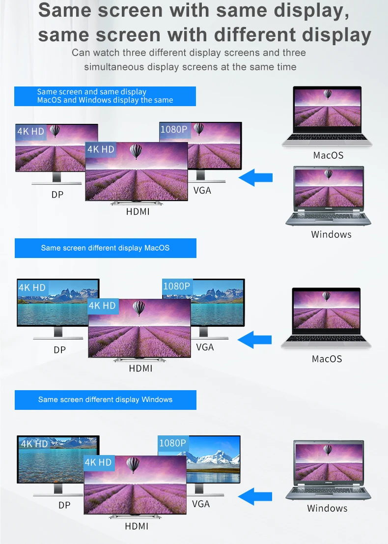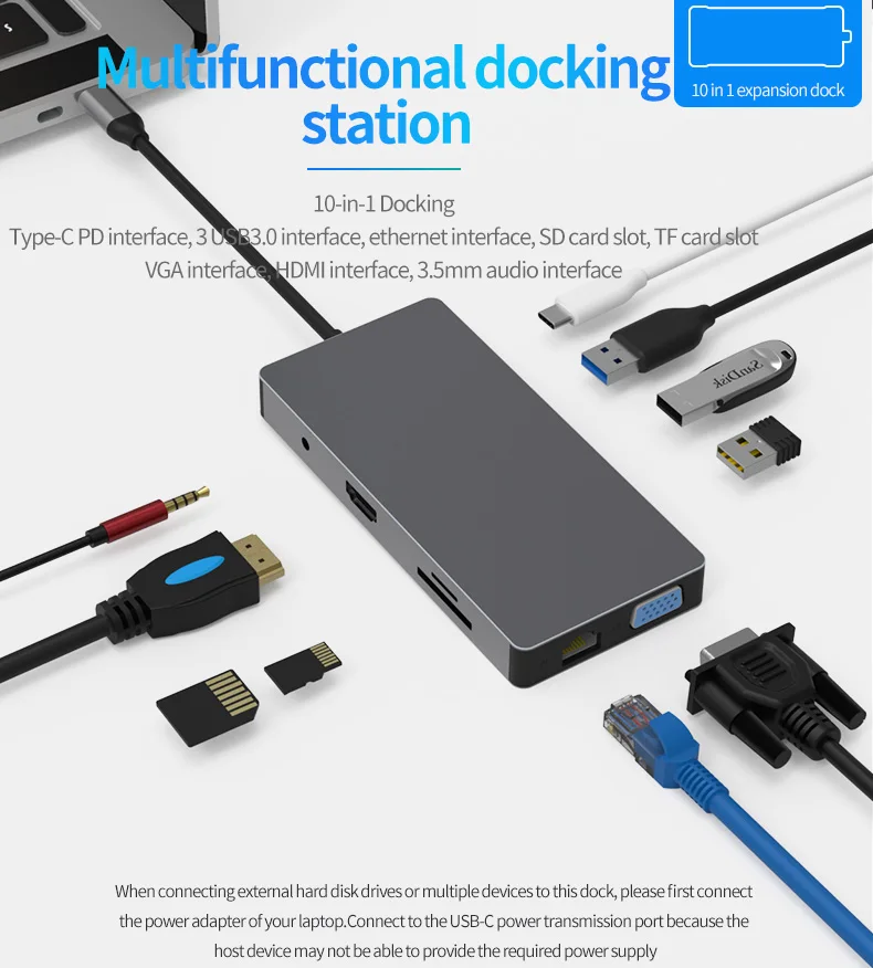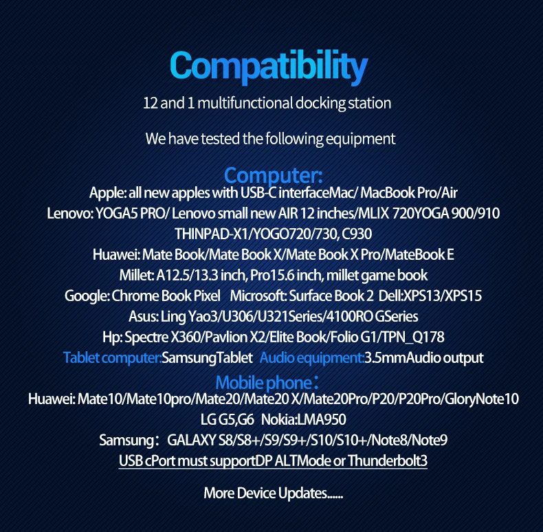 Важное примечание-При подключении ноутбука, не поддерживает зарядку мобильный телефон через USB-A или USB-C женский порт из-за ограниченной мощности.Пожалуйста, включите питание при подключении к энергоемким устройствам; Поддержка одновременного подключения 1 HDD / SSD.Чтобы избежать помех Wi-Fi, вы можете обернуть корпус линии рядом с портом type-c фольгой или с маршрутизатором частоты 5 ГГц. Кроме того, отключите ethernet-кабель и PD зарядный кабель от адаптера, когда он не используется.-Для Samsung Galaxy S10 / S9 / S8 / Note9 / 8, он совместим с режимом Dex через концентратор, версия телефонной системы требует Android 9,0 или выше.-Для ноутбуков Xiaomi мы рекомендуем подключить неоригинальный адаптер питания PD, такой как Apple, адаптер Dell для нормального использования.Когда выходные порты HDMI и VGA работают одновременно, на 2 дисплеях отображается только одно и то же изображение, а максимальное разрешение обоих портов составляет 1080P.-3,5 мм аудиоразъем не поддерживает микрофон.