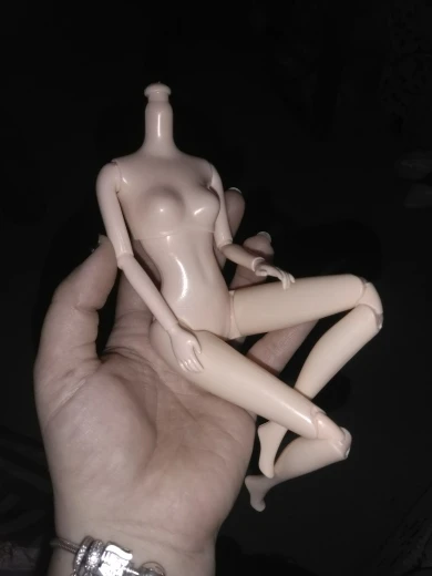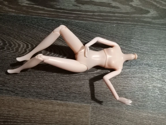 Хорошее по форме тело. Изящное, но не худое. Шарниры в ногах и руках рабочие. Но пластик торса очень тонкий и хрупкий. По периметру торса все в трещинах. Грудной шарнир не работает. Не двигается, не сгибается, не разгибается. Цвет нормальный. Нежный.