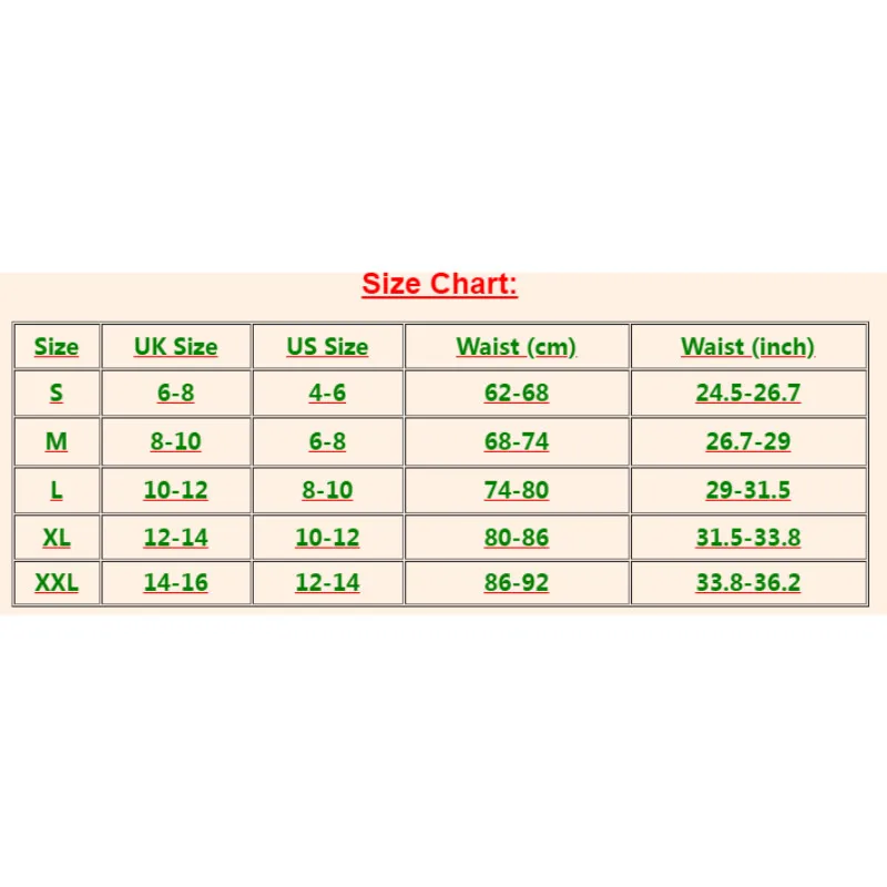 Размер Размер Великобритании Американский размер Талия (см) Талия (дюйм) S 6-8 4-6 62-68 24,5-26,7 М 8-10 6-8 68-74 26,7-29 L 10-12 8-10 74-80 29-31,5 XL 12-14 10-12 80-86 31,5-33,8 XXL 14-16 12-14 86-92 33,8-36,2