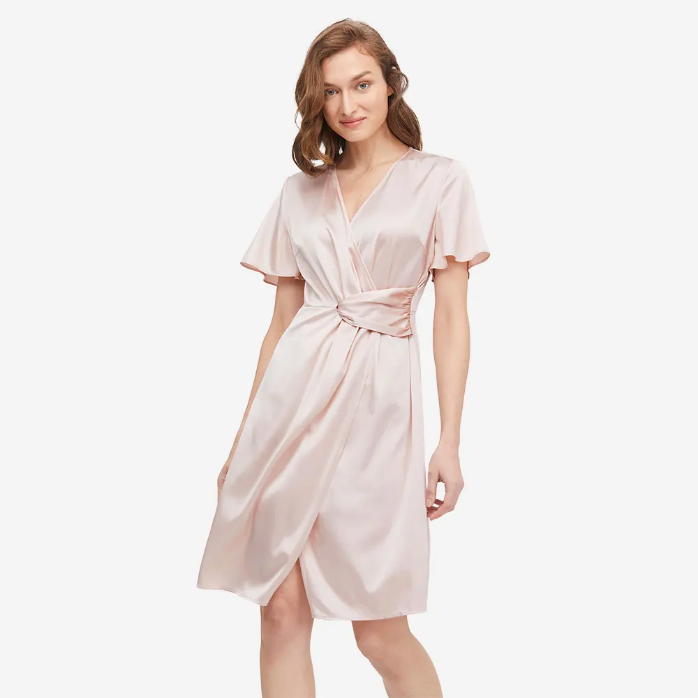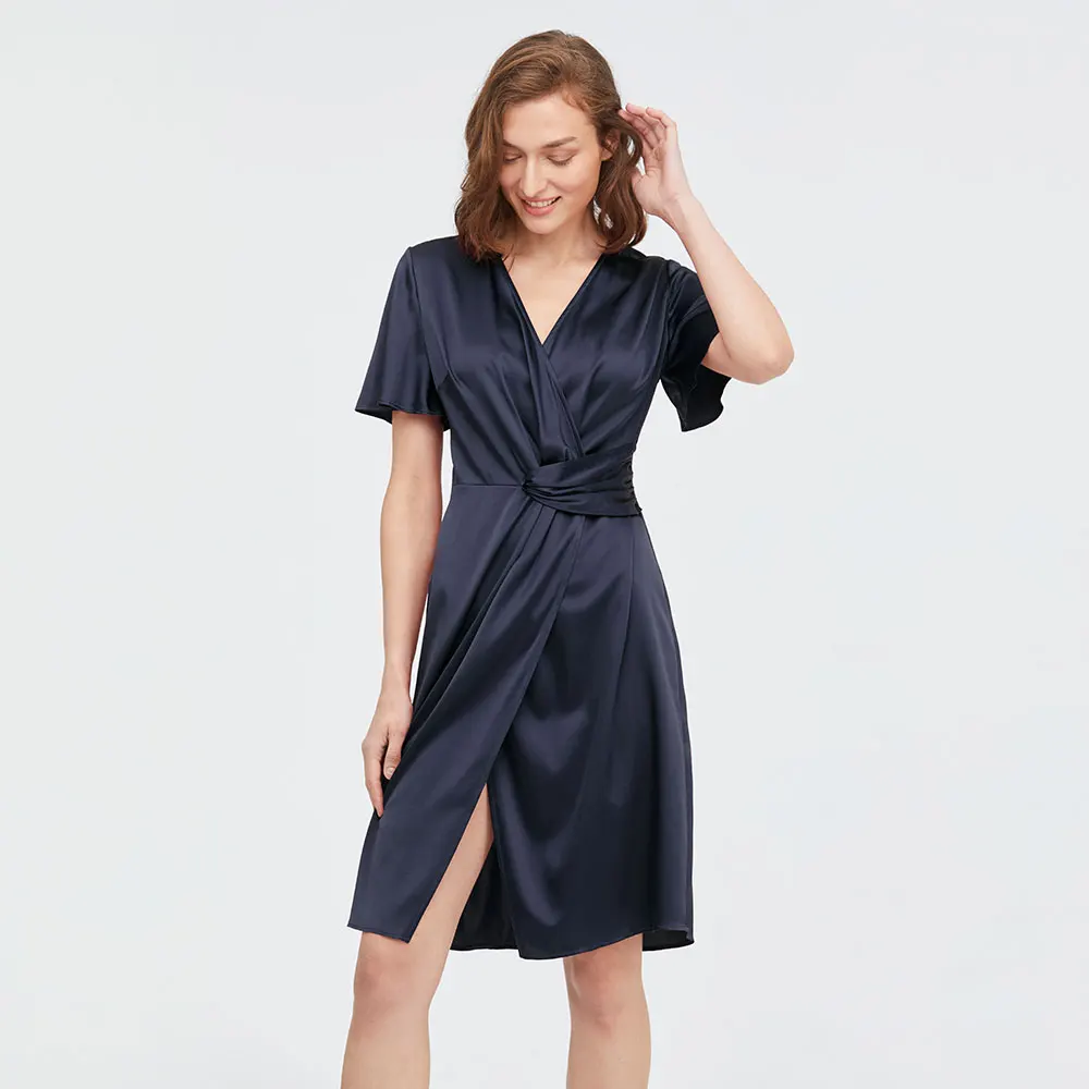 Элегантность и мода легко достигаются при ношении этого обычного шелкового платья.Он сделан из роскошной шелковой ткани с запахом силуэта с v-образным вырезом и свободными короткими расклешенными рукавами. И наиболее ярким моментом является Перекрывающийся дизайн спереди. В сочетании с облегающей талией вы будете выглядеть стройнее. Прикрепляйте булавку к груди, и уникальный дизайн юбки позволит избежать случайного контакта.90% шелк тутового шелкопряда + 10% спандекс-растягивается, лучше подходит для формы тела, без морщинНиже коленаСкрытая молнияСтандартная посадка
