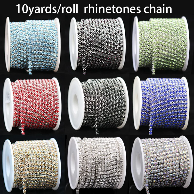Ss6-ss38 прозрачные стразы s, Однорядная цепочка, 10 ярдов/1 рулон, серебристые металлические Редкие стразы, отделка, сделай сам, Швейные аксессуары