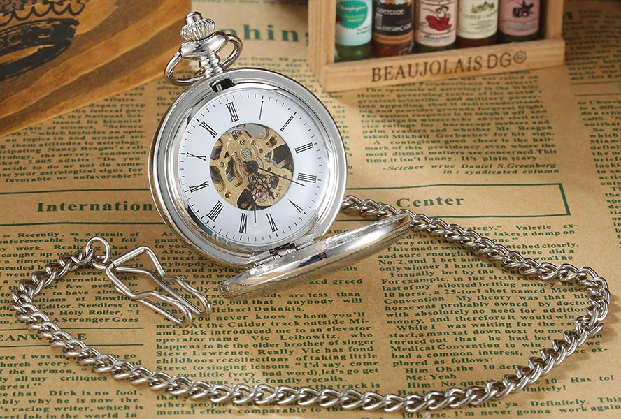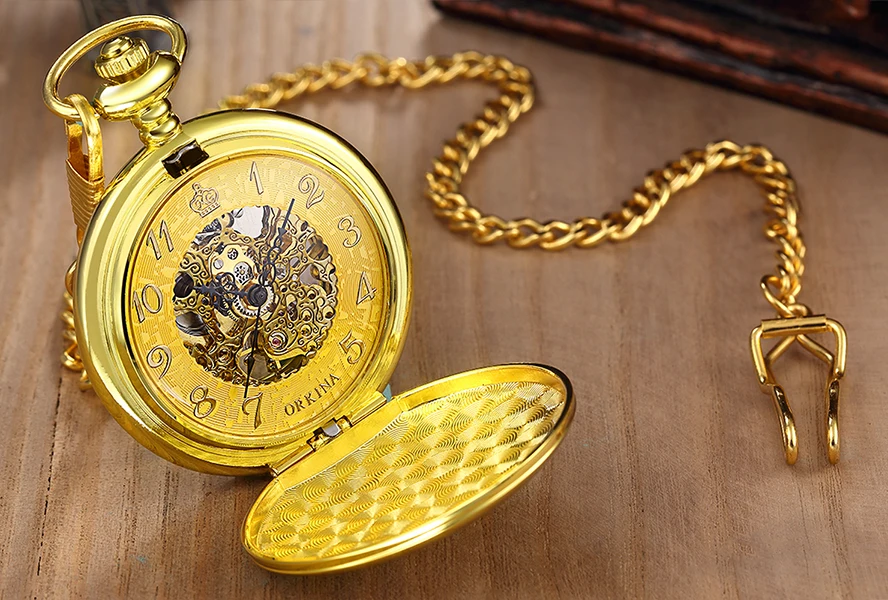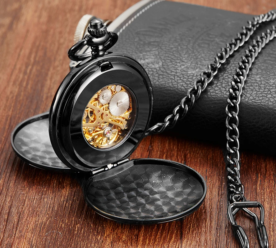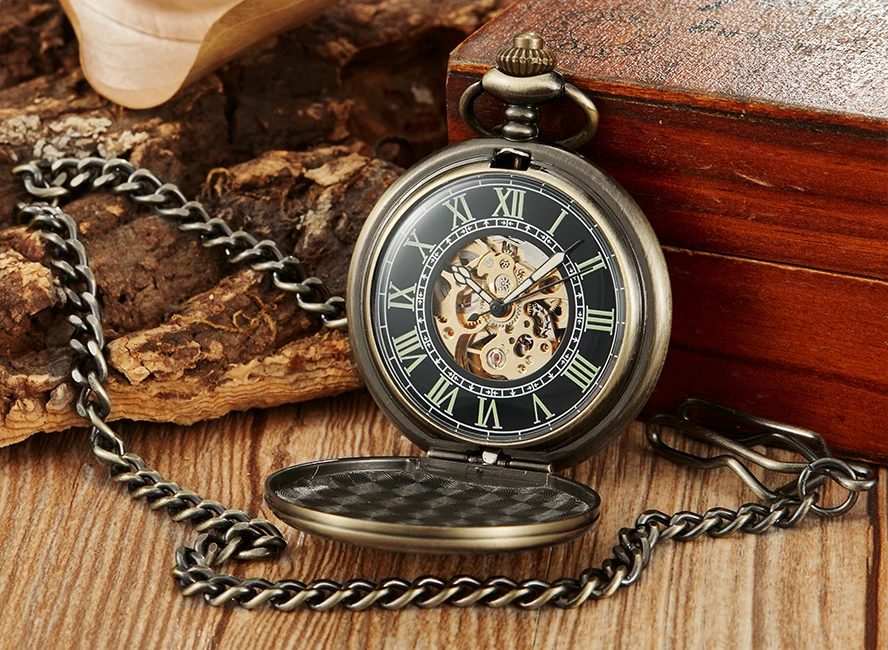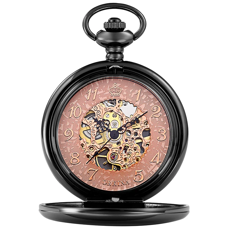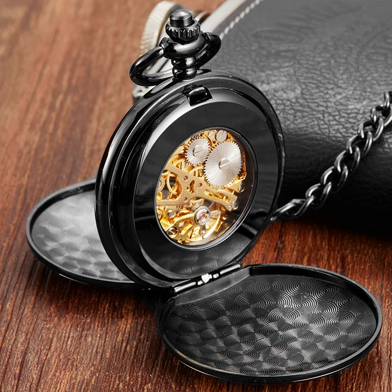 Роскошный Золотой циферблат, черные механические карманные часы, кулон в виде скелета, брелок, цепь Reloj для мужчин, античная бронза, стимпанк, Montre de poche