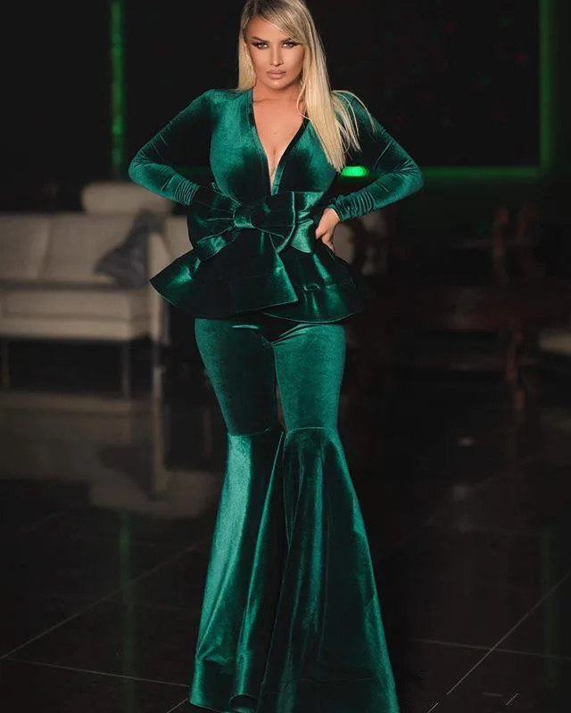 Темно-зеленый бархатный комбинезон, вечерние наряды с бантом, баской, V-образным вырезом, платья Noiva, официальное платье с длинным рукавом, брючный костюм