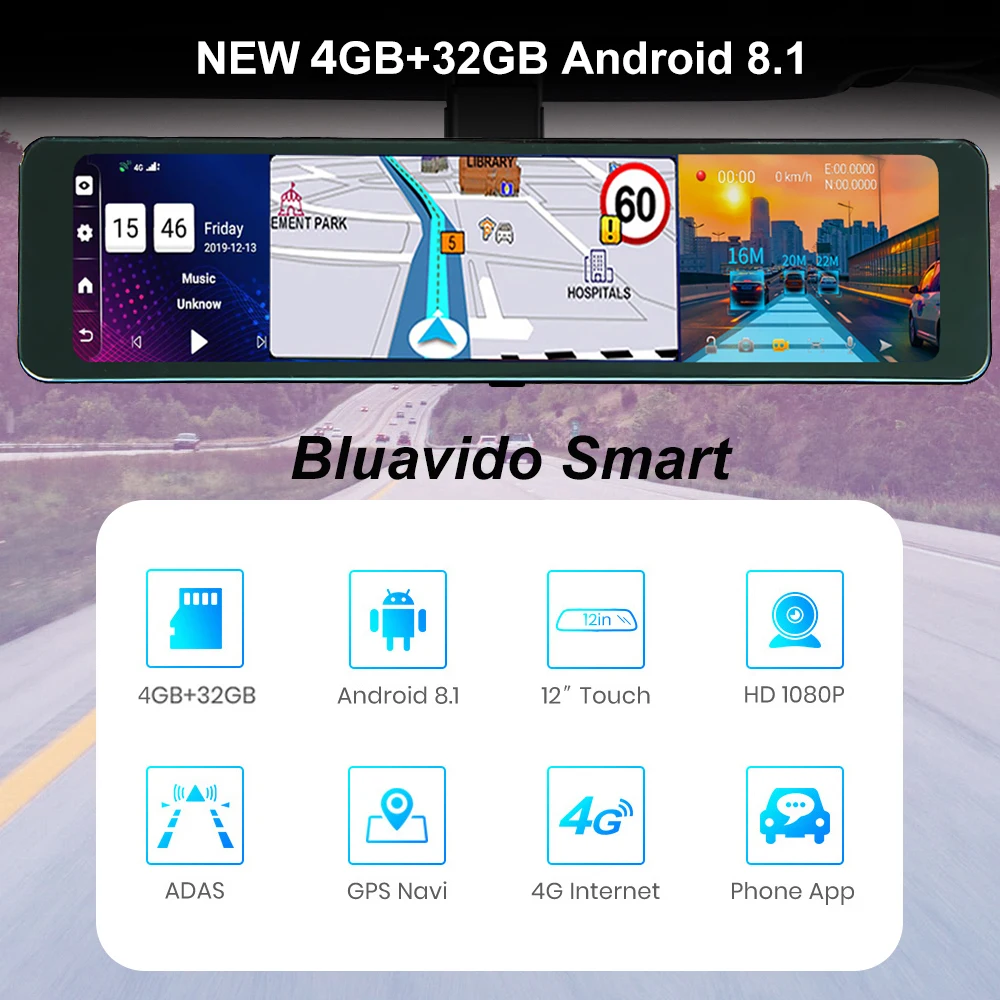 Видеорегистратор Bluavido, 12 "Android 8,1, ADAS, 4G, Full HD 1080P, GPS, Wi-Fi