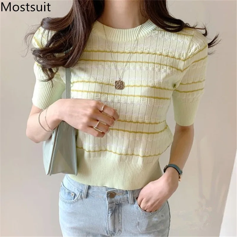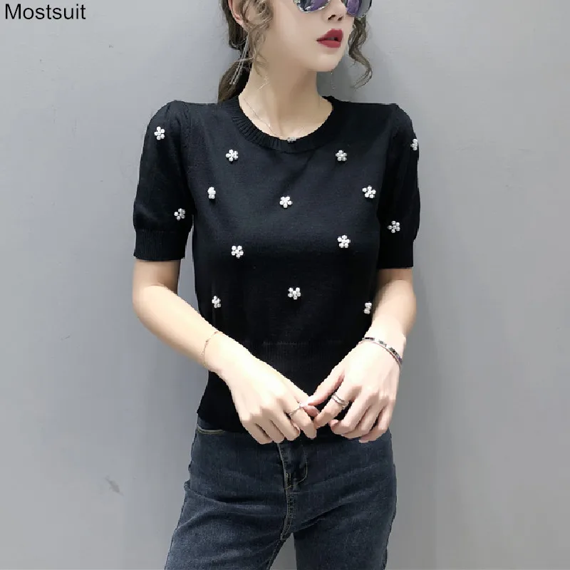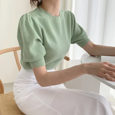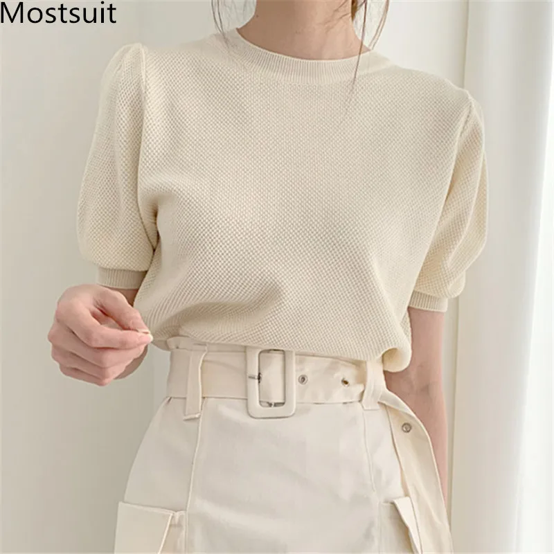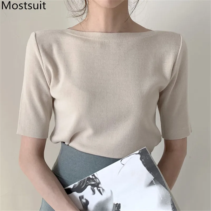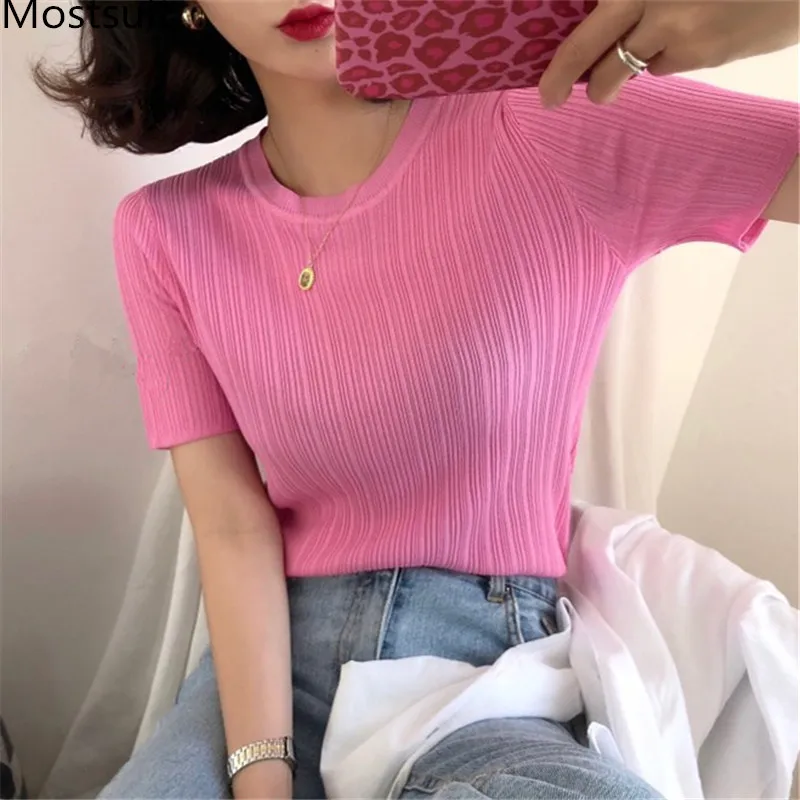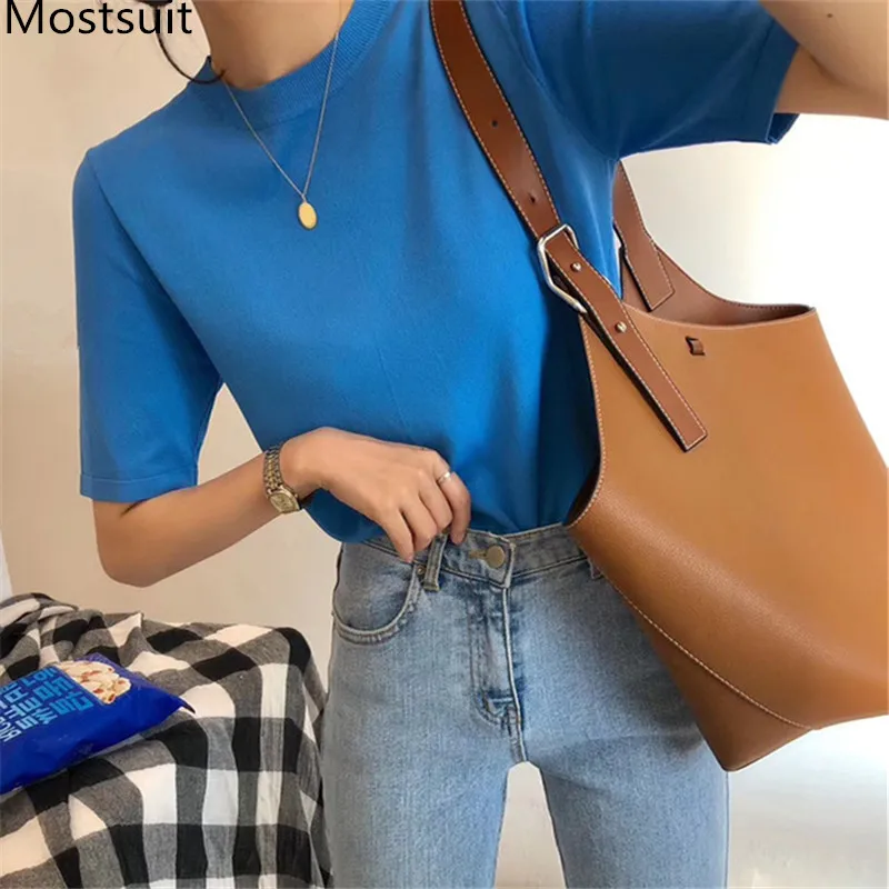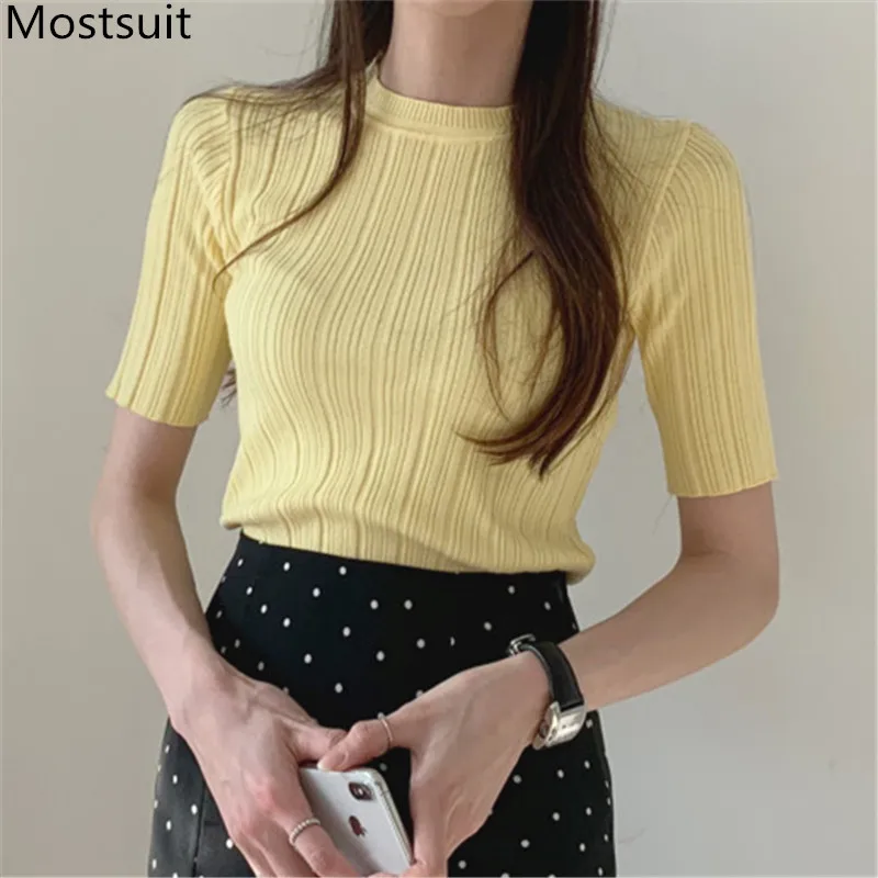 Корейские трикотажные однотонные женские туники, топы, летние пуловеры с коротким рукавом и круглым вырезом, элегантные модные женские футболки, 2020