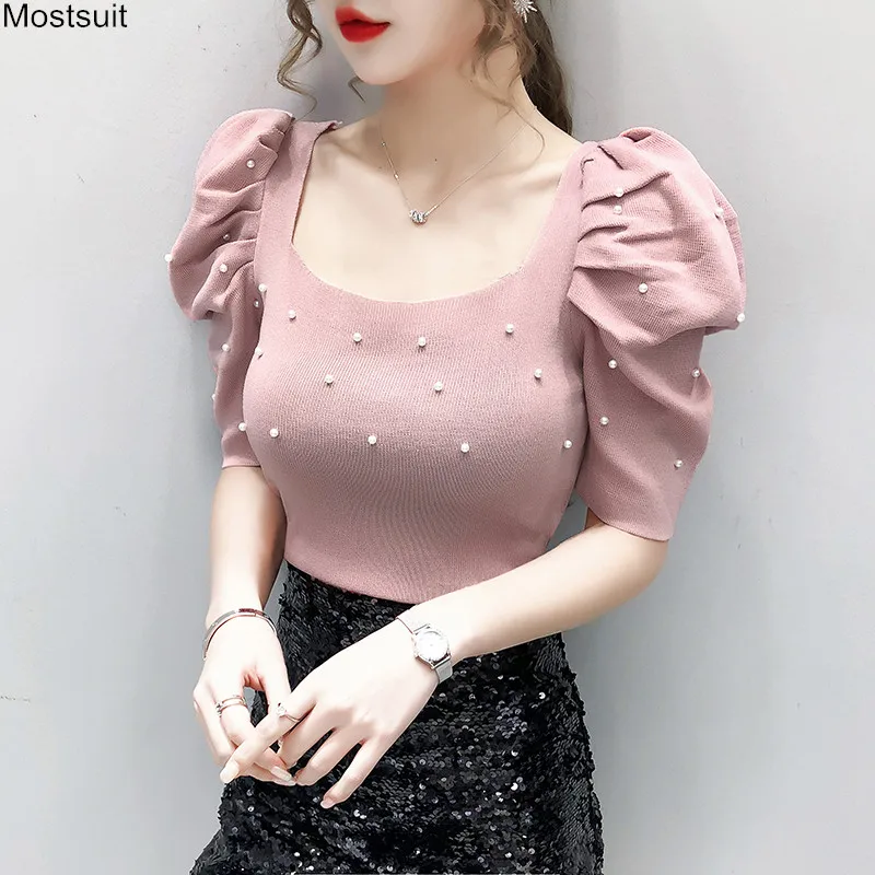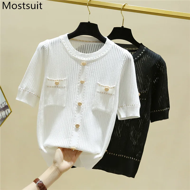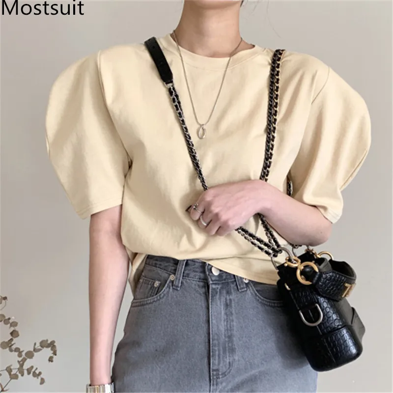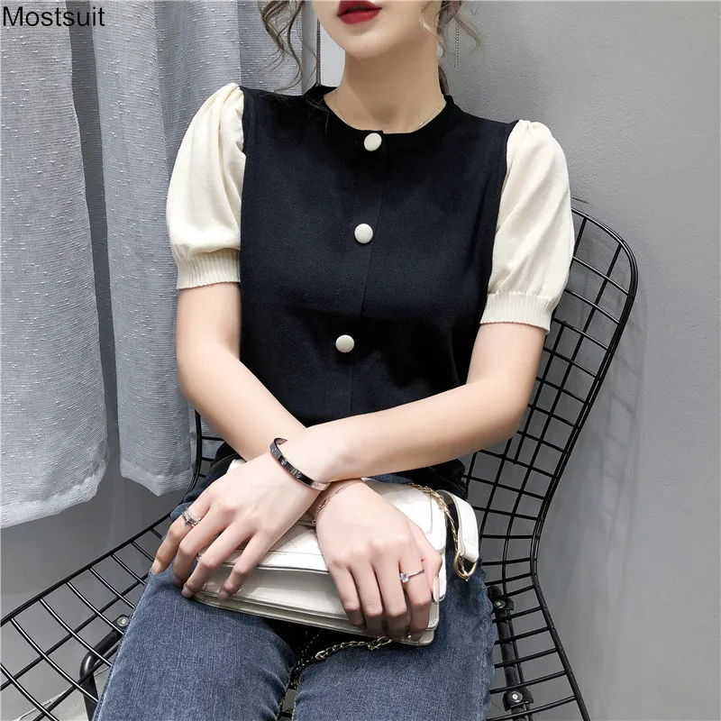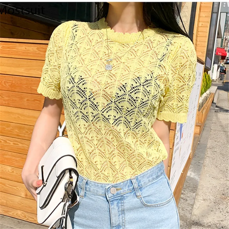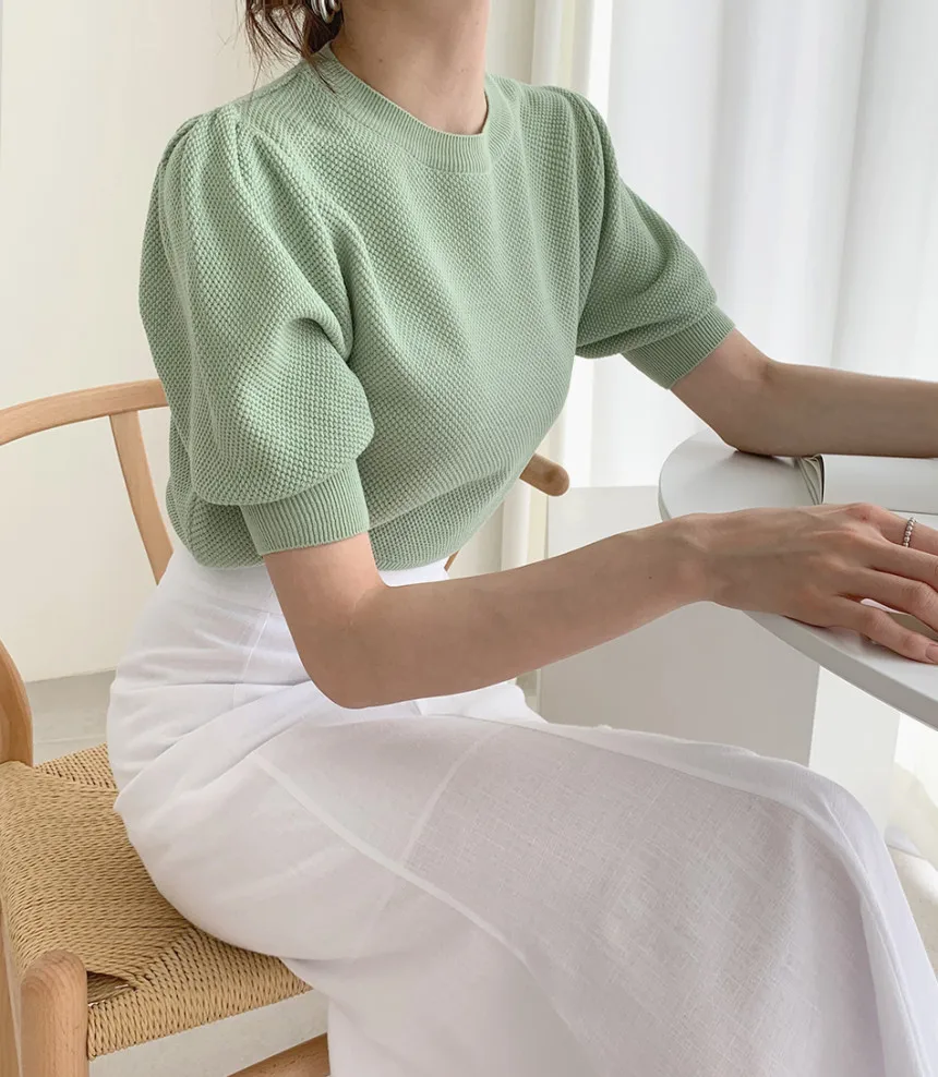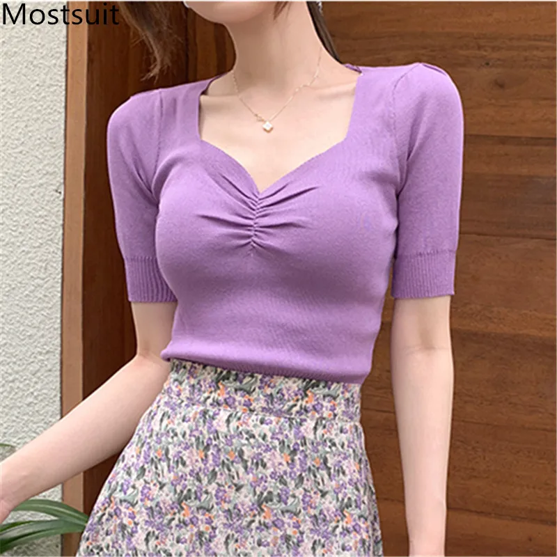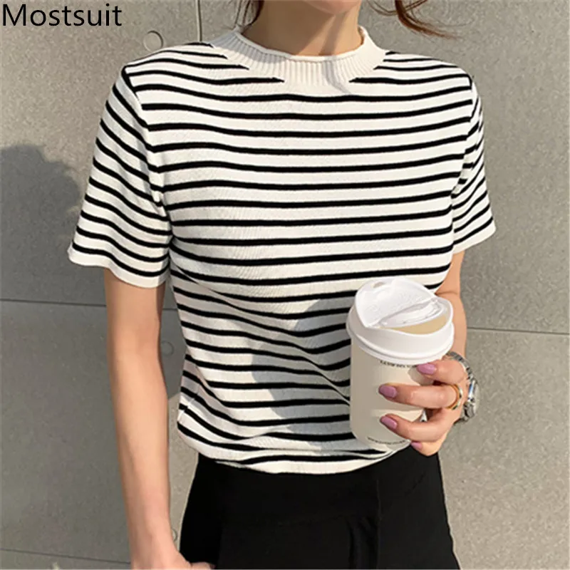Корейские трикотажные однотонные женские туники, топы, летние пуловеры с коротким рукавом и круглым вырезом, элегантные модные женские футболки, 2020