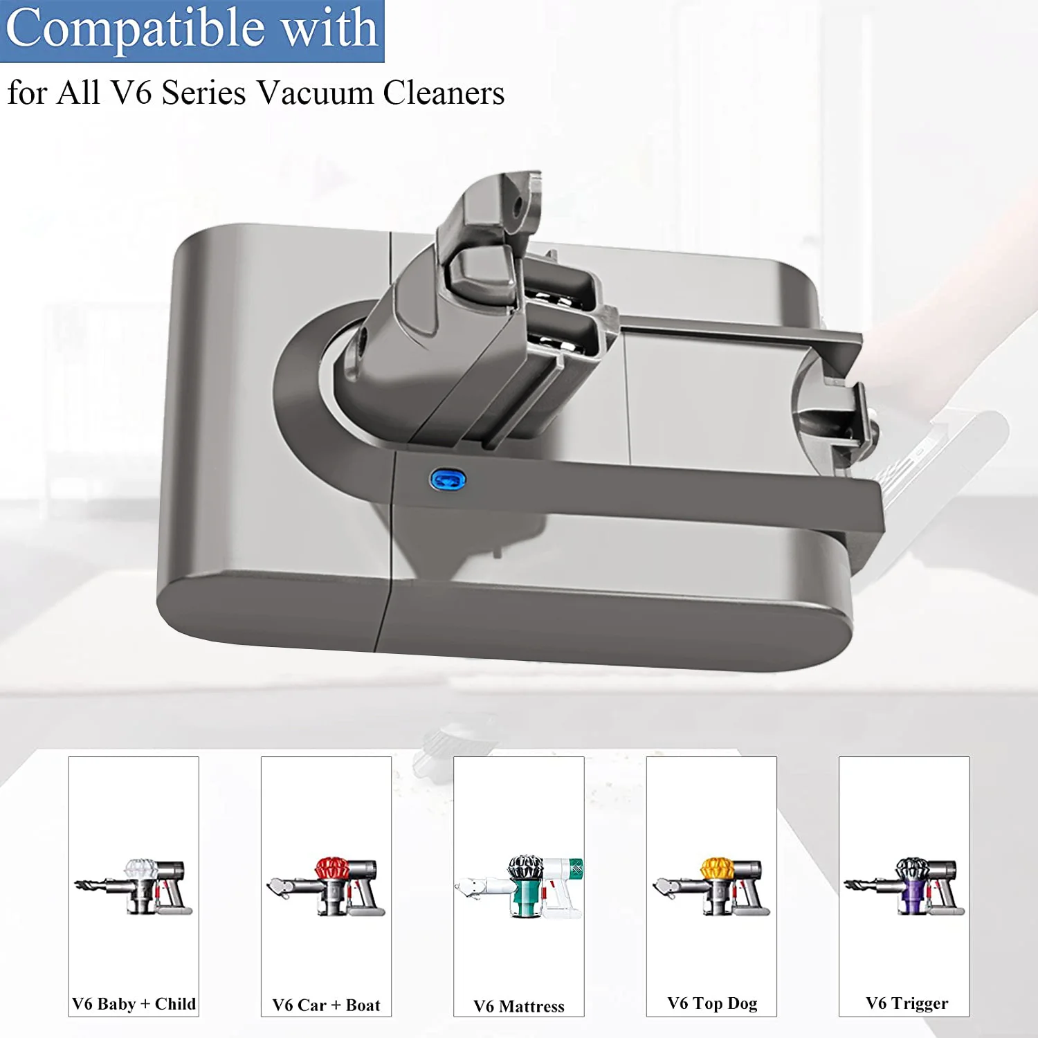 подошёл к пылесосу v6 . еще не проверял на время работы . пришел с заряжкнным , пылесос заработал . в зарядку вставился с небольшим усилием , где то видел комментарии, что заходит в гнездо зарядки туго , у меня вообщем нормально . размер один в один . винты крепления зашли , как родные . через пару недель отпишусь , по поводу времени работы