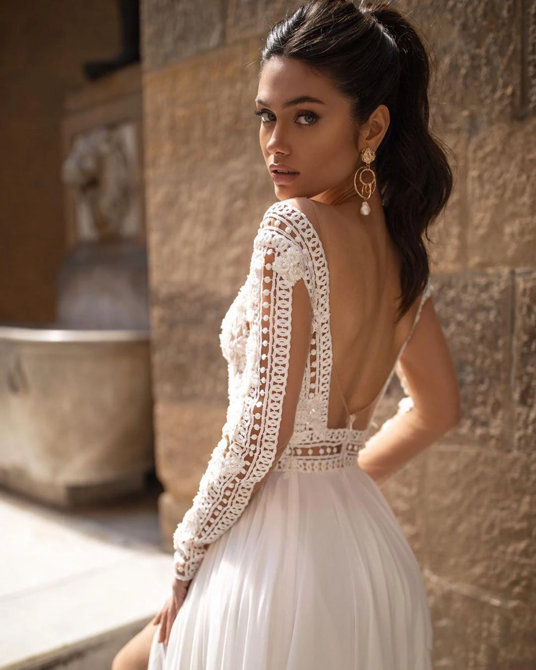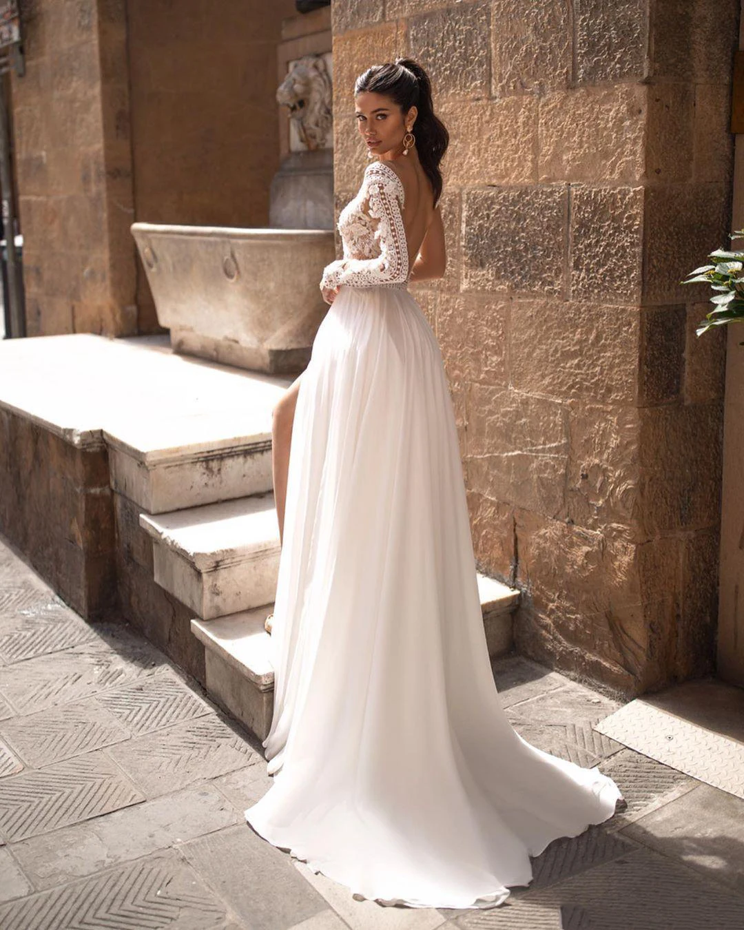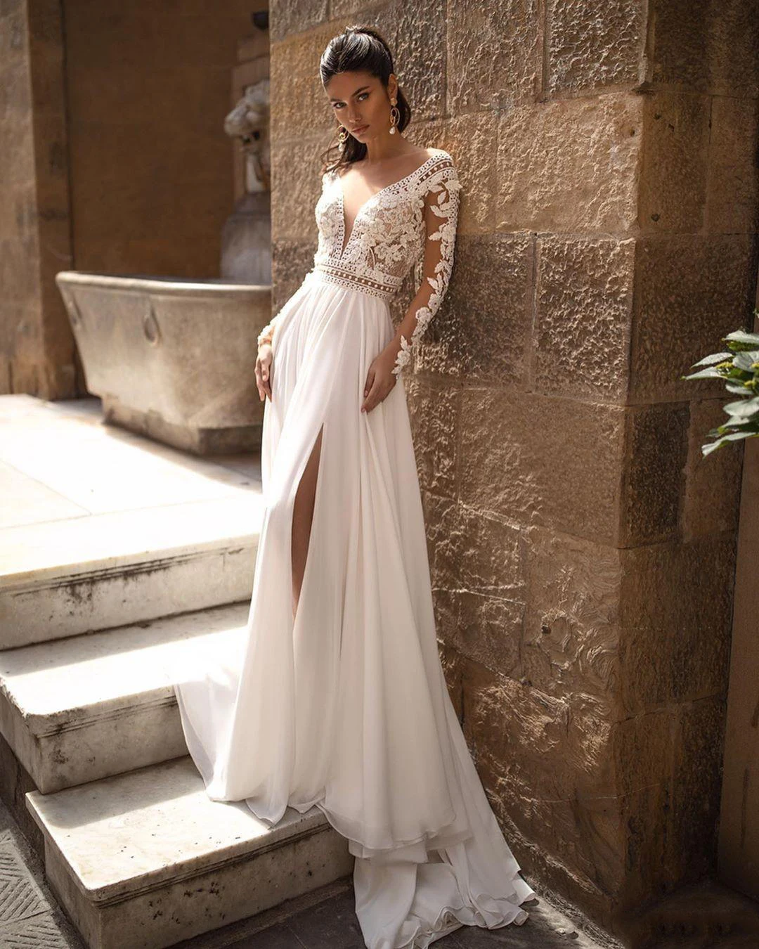 Шифоновое пляжное свадебное платье Booma, кружевное прозрачное богемное свадебное платье невесты в стиле бохо с открытой спиной и V-образным вырезом, с длинным рукавом и Боковым Разрезом на заказ