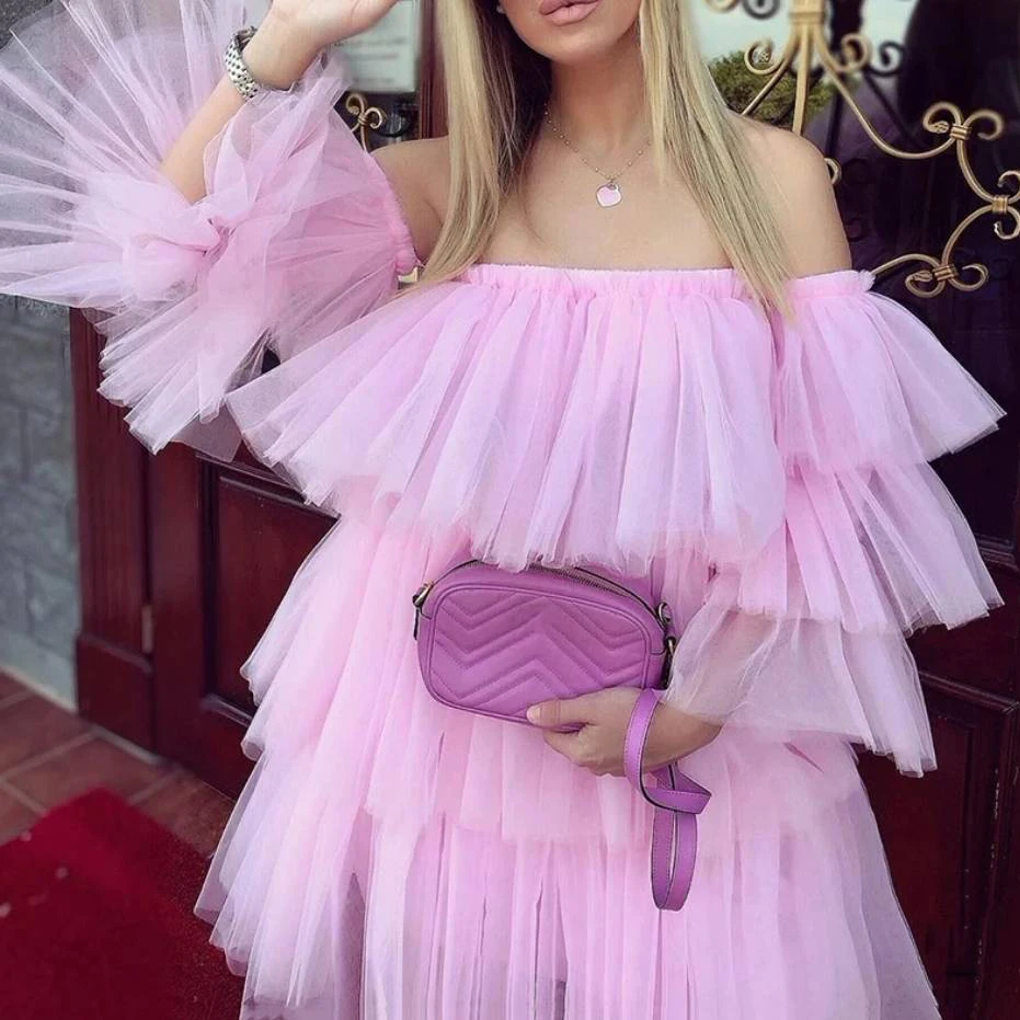 Женское вечернее платье с открытыми плечами, розовое Многоярусное п...