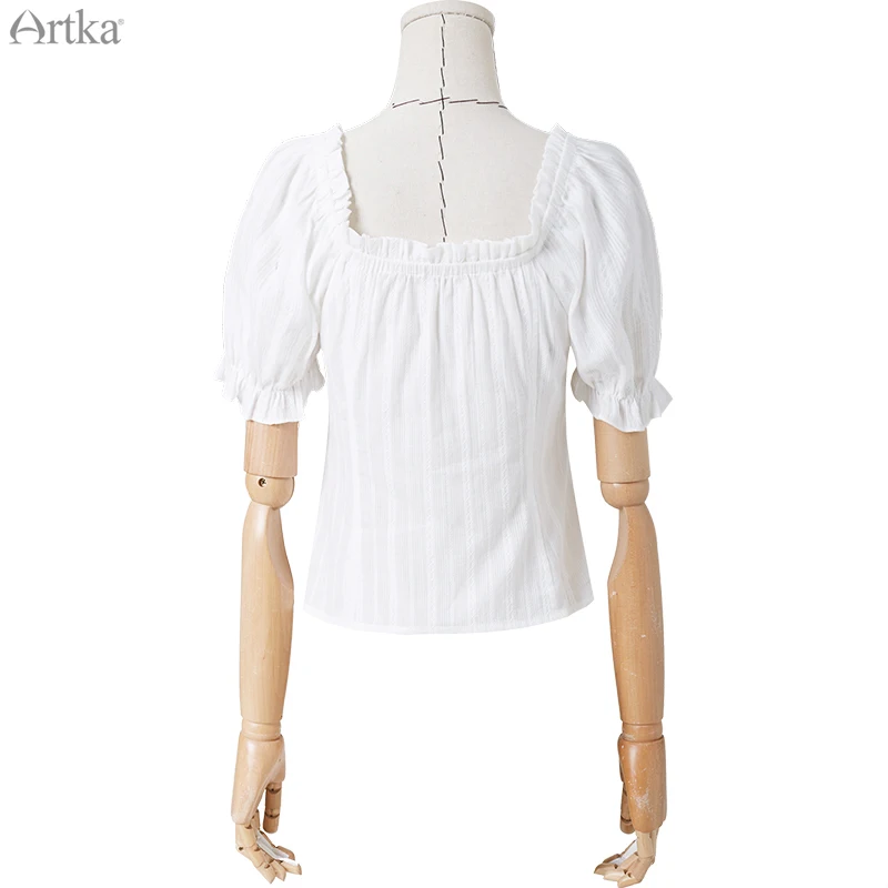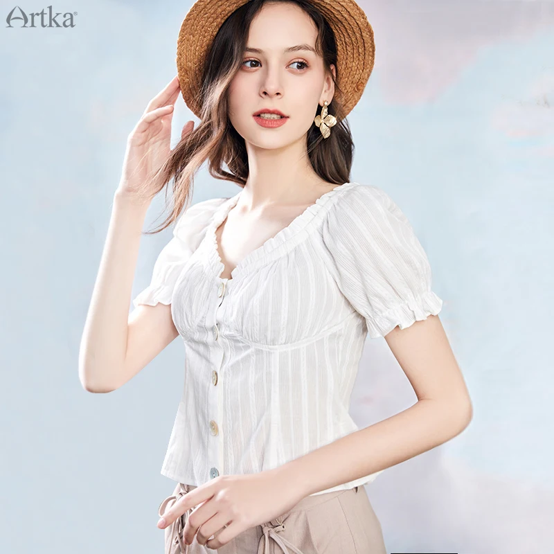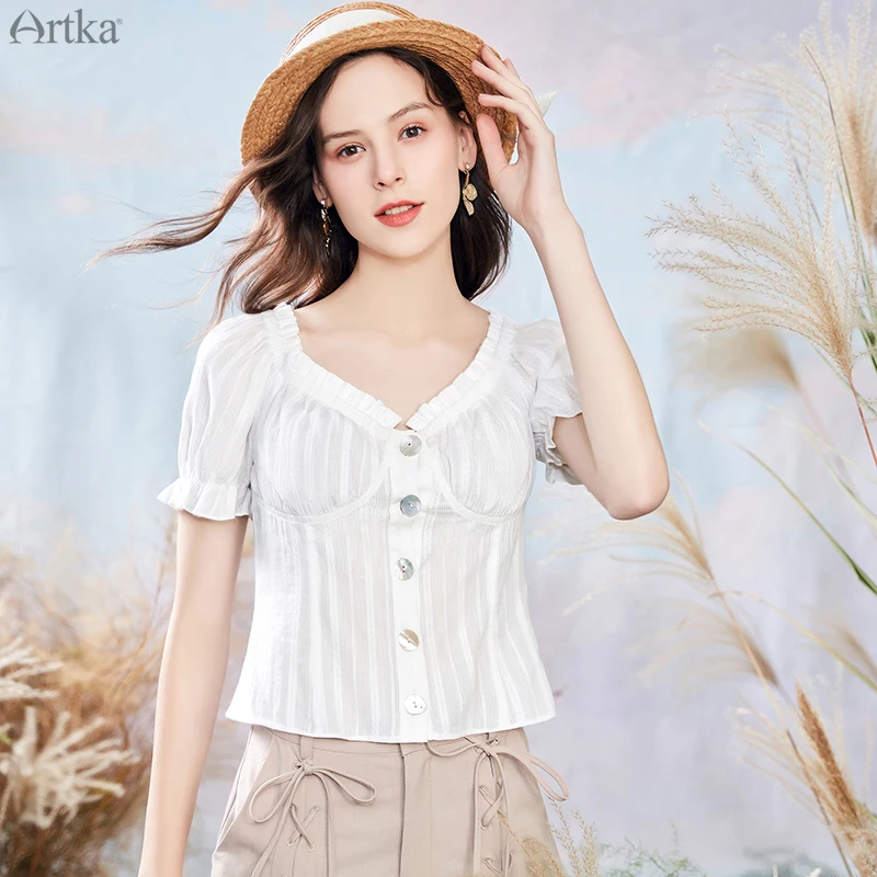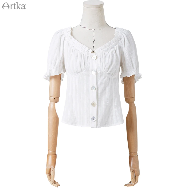 Рубашка ARTKA Женская с V-образным вырезом, блузка из чистого хлопка, винтажная сорочка в французском стиле, с короткими рукавами-фонариками, белая, на лето 2020