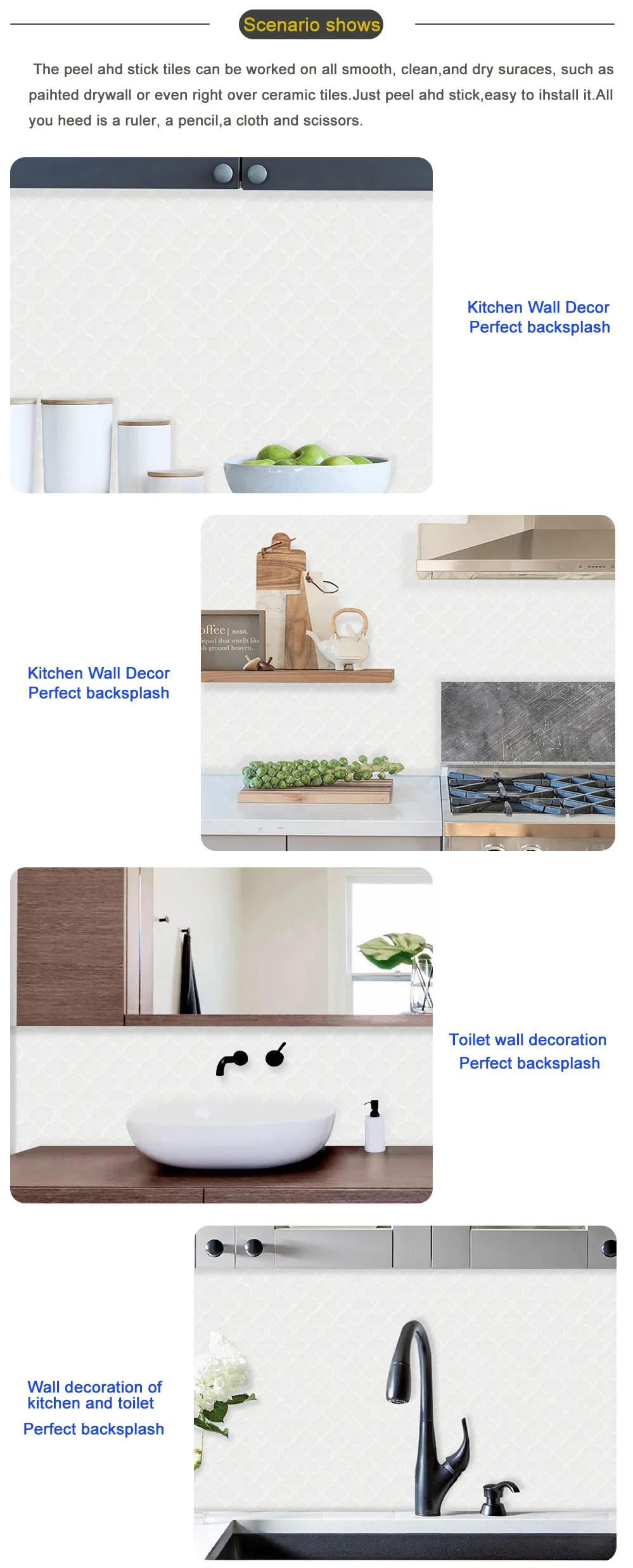 Плитку можно легко установить прямо на существующие панели или на гладкую поверхность. Специально разработан для кухонного щитка и щитка ванной комнаты, плитка устойчива к нагреву печей и влажности ванных комнат.