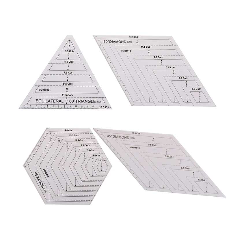 Детали:Применение: измерение, рисование, инструмент для сшивания, может использоваться с ножом в качестве режущей линейки.Детали линии и четкие, высокая точность, идеальный инструмент для шитья.Прозрачный цвет, может быть хорошо виден как на темном, так и на фоне светильник.Материал: прозрачный акриловый материал, изысканный процесс печати, он не легко исчезнуть.Длина:Треугольная Линейка: 13,5 см/5,31 дюймаШестиугольная Линейка: 15,5 см/6,09 дюйм (ов)45 градусов Линейка: 11,5 см/4,52 дюйма60 градусов Линейка: 13,5 см/5,31 дюйма