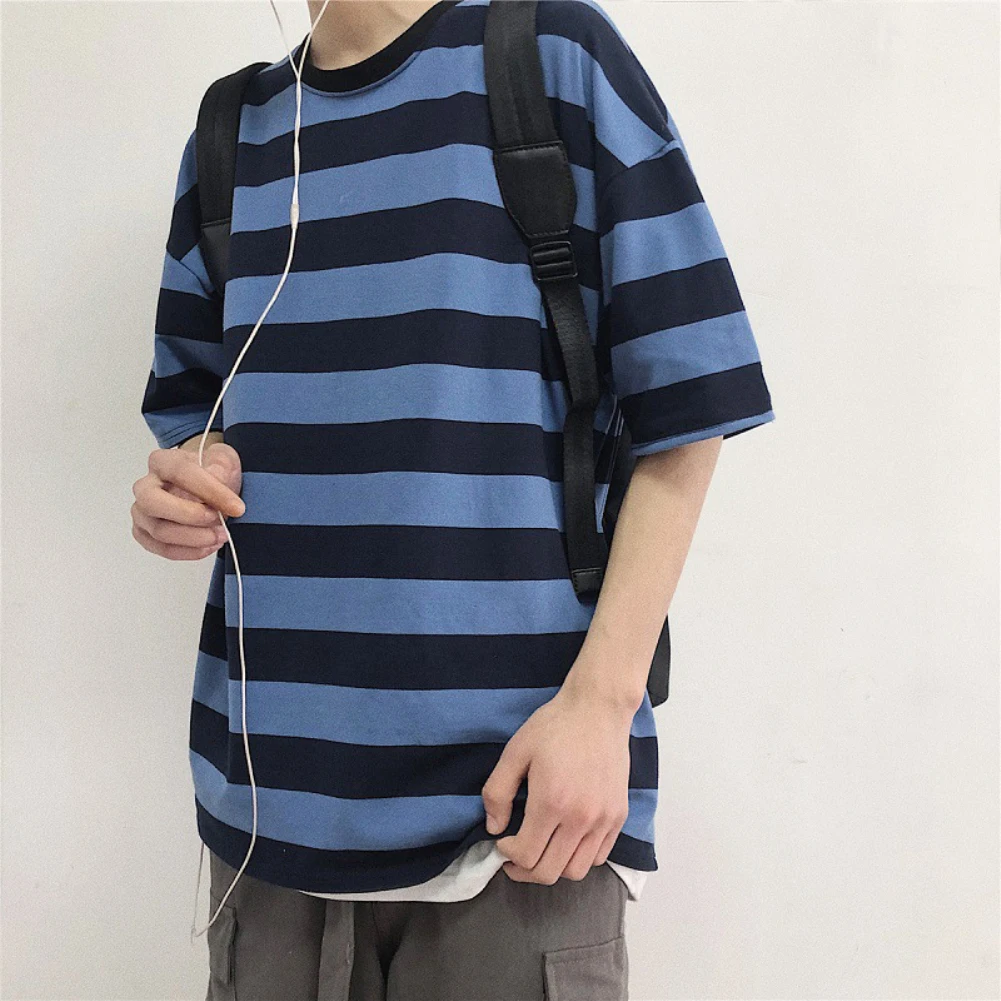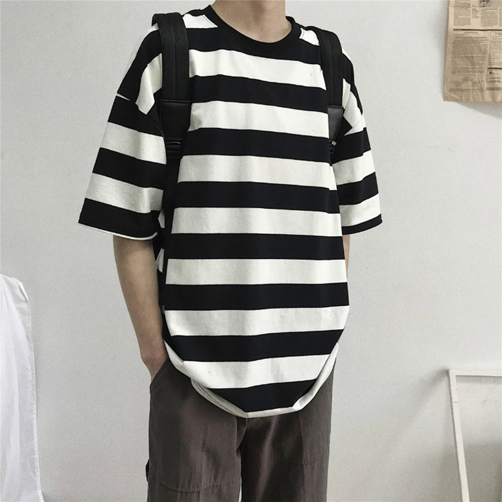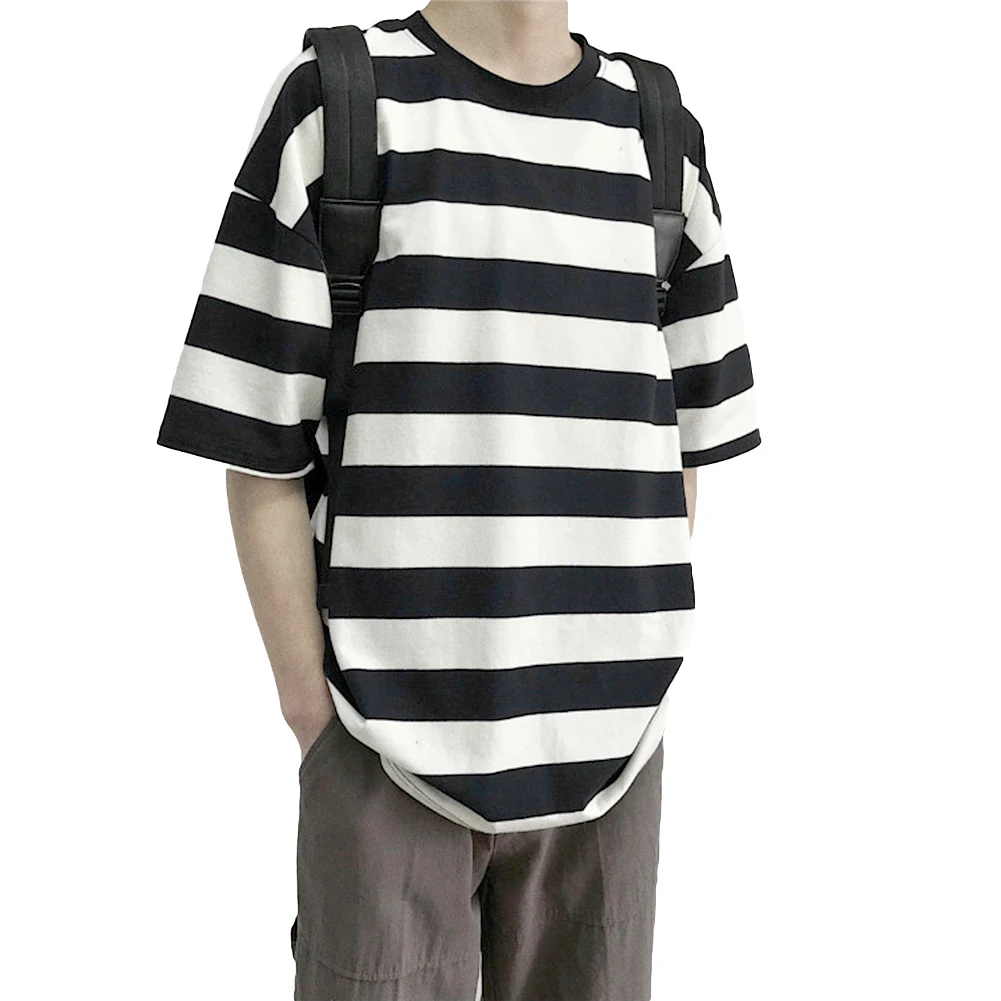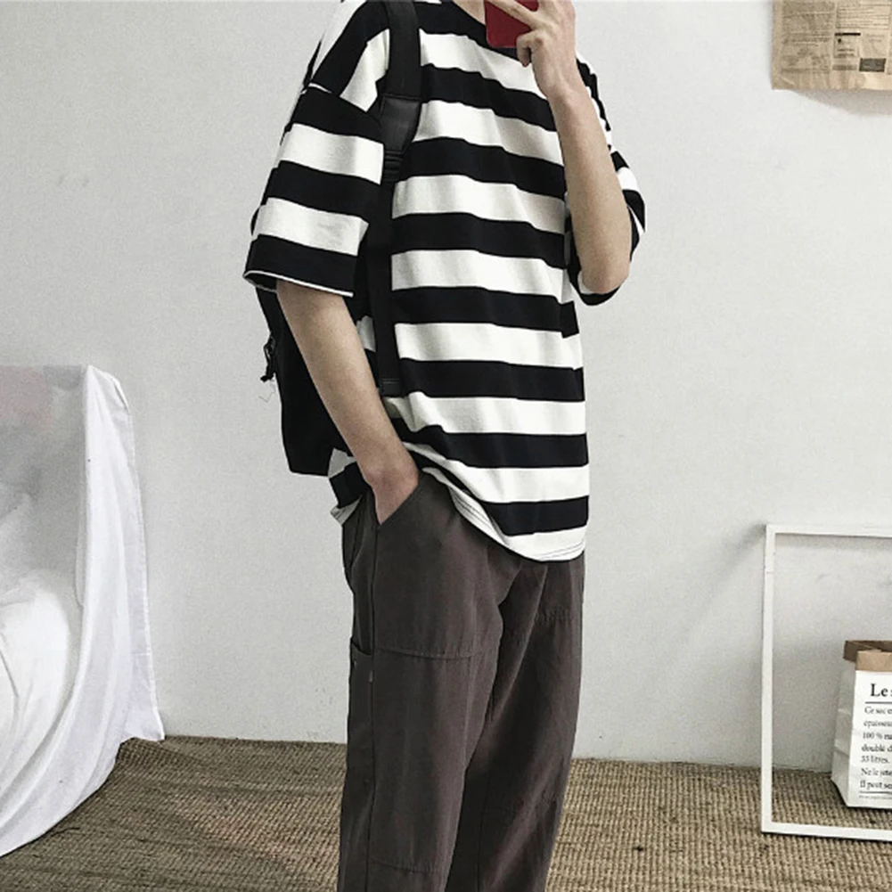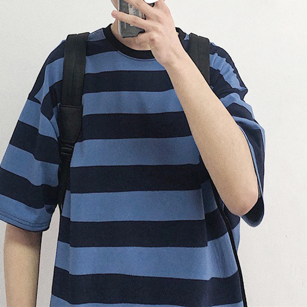 Мужская футболка, стильная футболка с коротким рукавом в горизонтальную полоску, Мужская хлопковая футболка с круглым вырезом, свободная Мужская футболка, Мужской Топ
