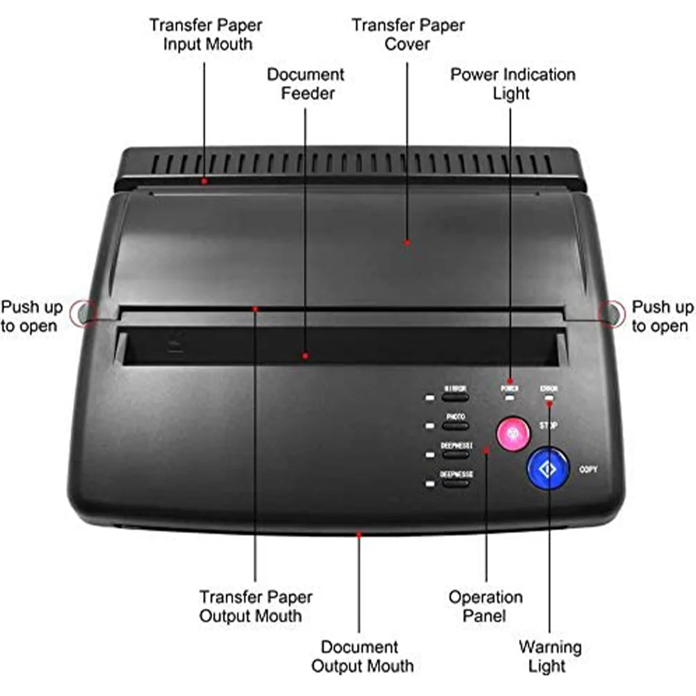 1. Это новейшая Самостоятельная машина для переноса татуировок. Татуировщик или профессионал могут быстро и эффективно копировать дизайн на шаблон бумаги в несколько простых шагов.
