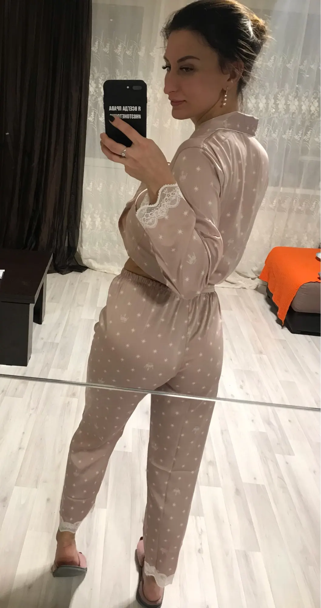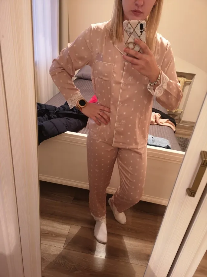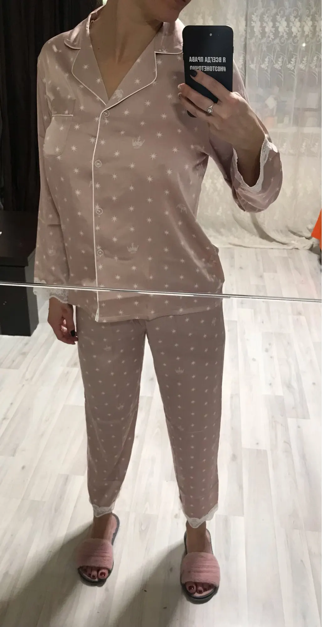 Потрясающая пижама отменного качества! Из всех пижам, купленных мною на алиэкспрессе, эта - лучшая! Материал максимально приятный, совсем не электролизуется и абсолютно не мнется. Деликатную стирку выдержала отлично: не села и не полиняла. Швы ровные, претензий к пошиву нет. На рост 163 см, 87-67-92, вес 55 кг - размер М сел идеально, длина штанов полная. На пуговках наклеены стразы, смотрится гармонично. До Москвы товар доехал за 2 недели (заказывала в черную Пятницу). Смело рекомендую товар к покупке и благодарю продавца!