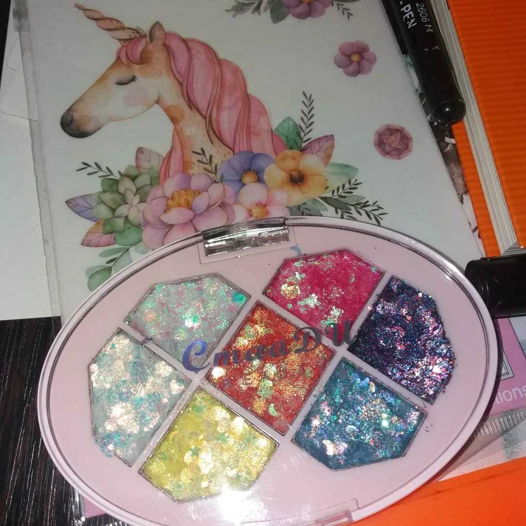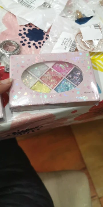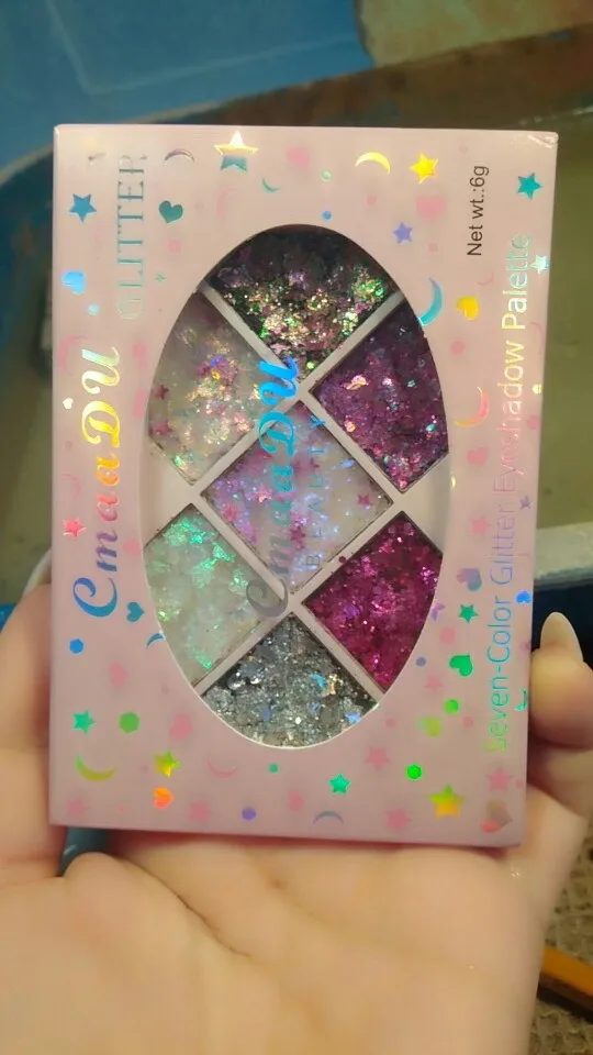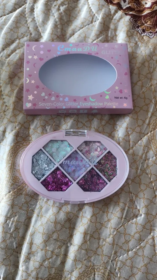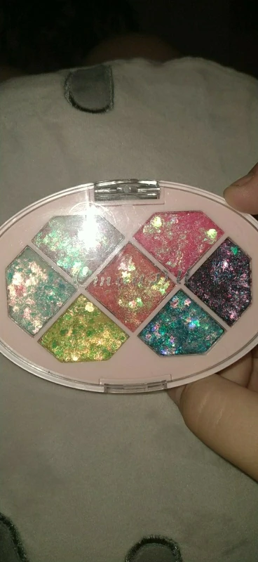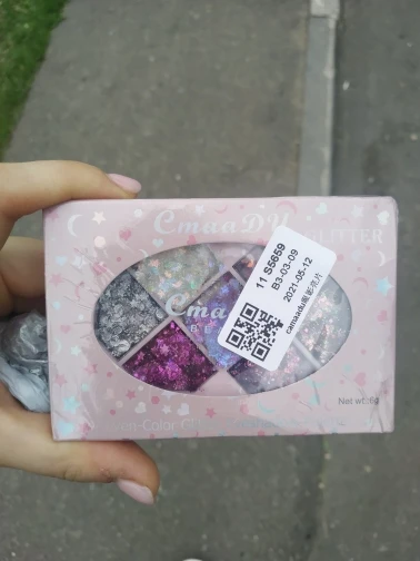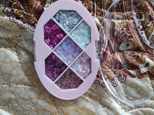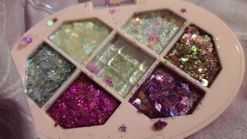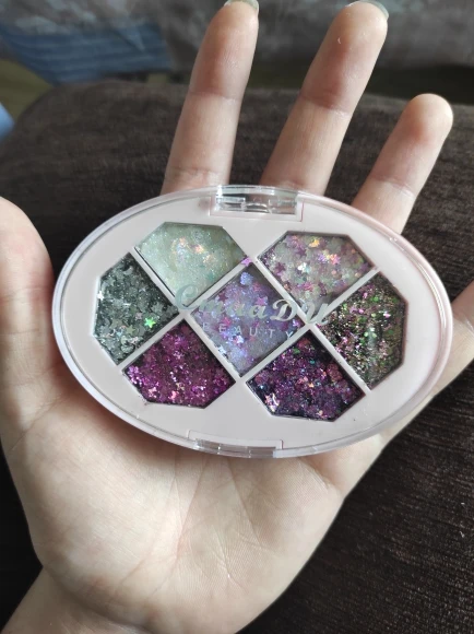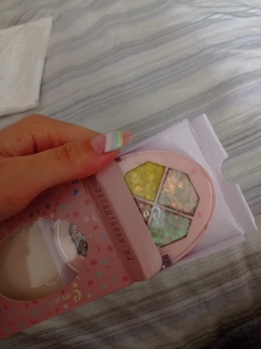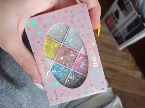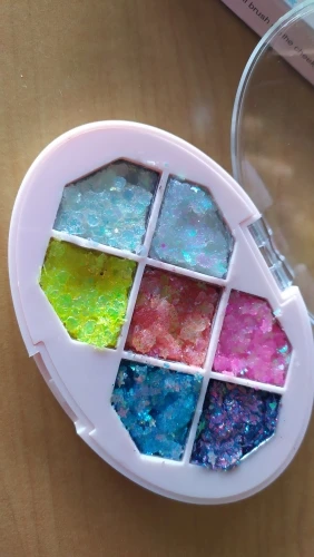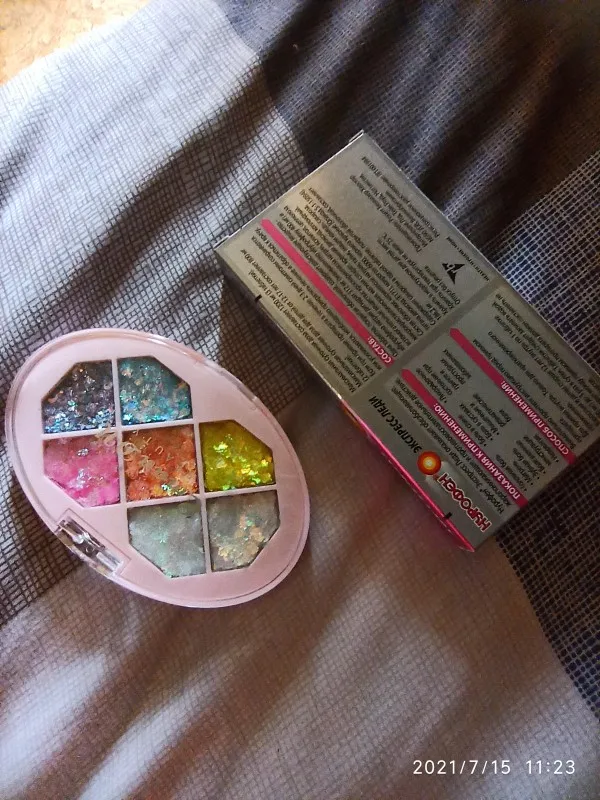 Товар был доставлен через две недели после того как был оформлен заказ, а потому, нареканий к срокам у меня нет Пришла палетка глиттеров в мелком пакете, и тут я сразу отмечу: один из оттенков попросту вывалился и прилип к крышке. Некачественно уложили, или же так обращались с палеткой на почте, не ясно, но за это одну звезду снимаю Что по итогу: нормальные за свою стоимость глиттеры. Хорошо набираются и распределяются кистью, но если провести пальцем, на нем все равно останутся блестки, т.е. ни о какой фиксации речи не идёт. Сами же глитттеры на коже не чувствуются, никакого дискомфорта и аллергии не произошло, поэтому смело берите