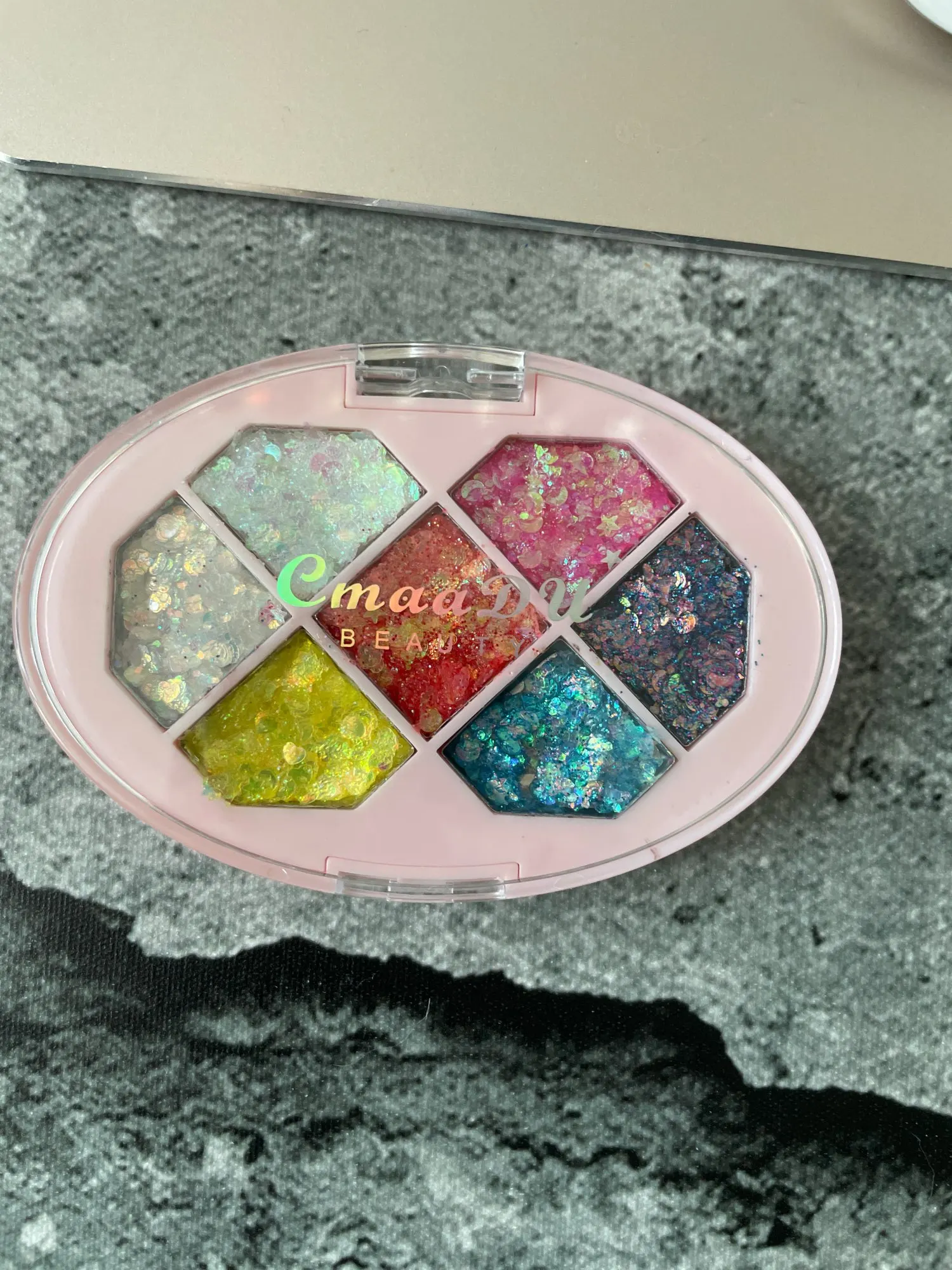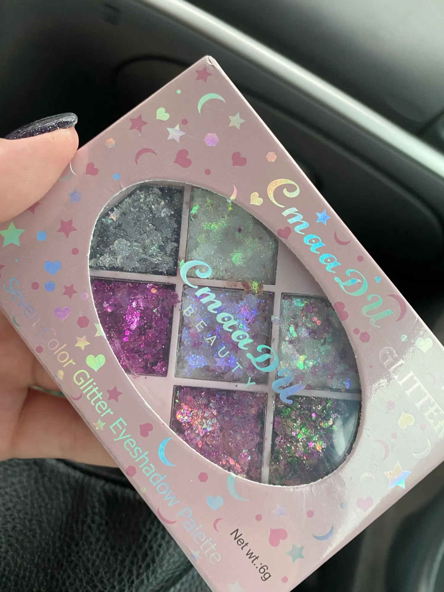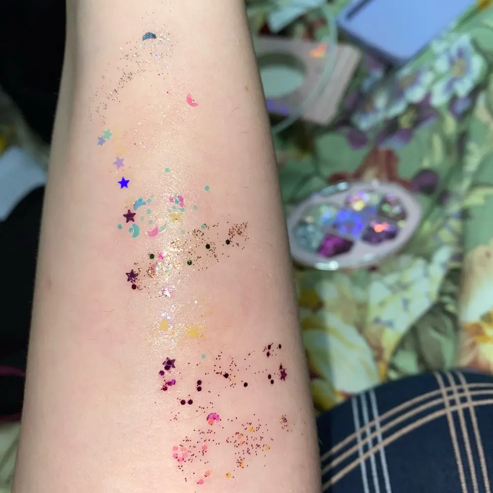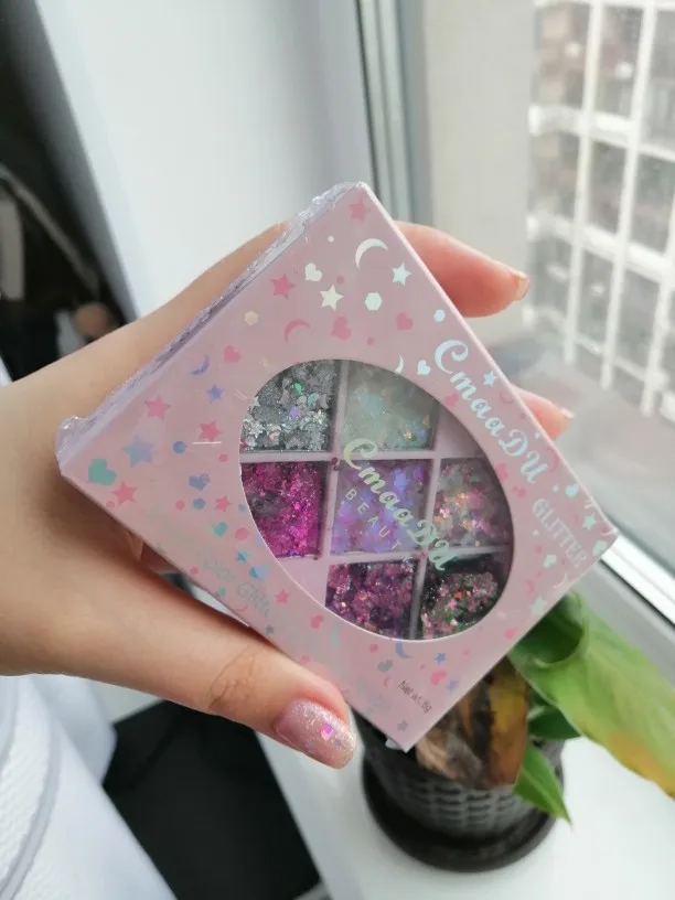 Товар был доставлен через две недели после того как был оформлен заказ, а потому, нареканий к срокам у меня нет Пришла палетка глиттеров в мелком пакете, и тут я сразу отмечу: один из оттенков попросту вывалился и прилип к крышке. Некачественно уложили, или же так обращались с палеткой на почте, не ясно, но за это одну звезду снимаю Что по итогу: нормальные за свою стоимость глиттеры. Хорошо набираются и распределяются кистью, но если провести пальцем, на нем все равно останутся блестки, т.е. ни о какой фиксации речи не идёт. Сами же глитттеры на коже не чувствуются, никакого дискомфорта и аллергии не произошло, поэтому смело берите