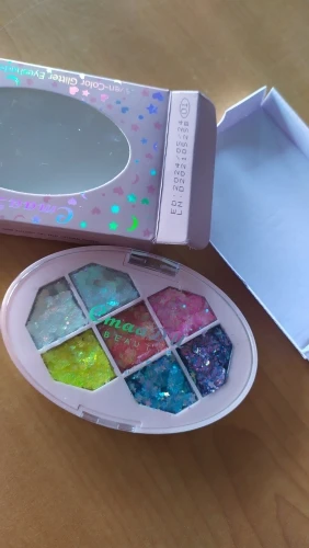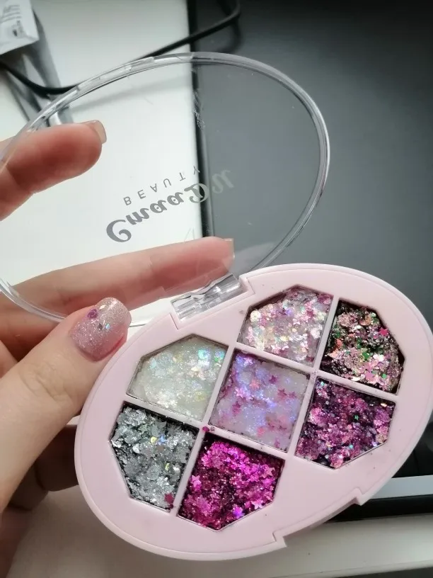Я в большом восторге! Заказ приехал вовремя (вместе с другими заказами), упакована палетка в симпатичную подарочную коробочку, дополнительно в защитной плёнке. Глиттер легко наносится и очень красиво выглядит! Пигмент смотрится вполне ярко за счёт мелкой пыльцы блёсток. Супер!