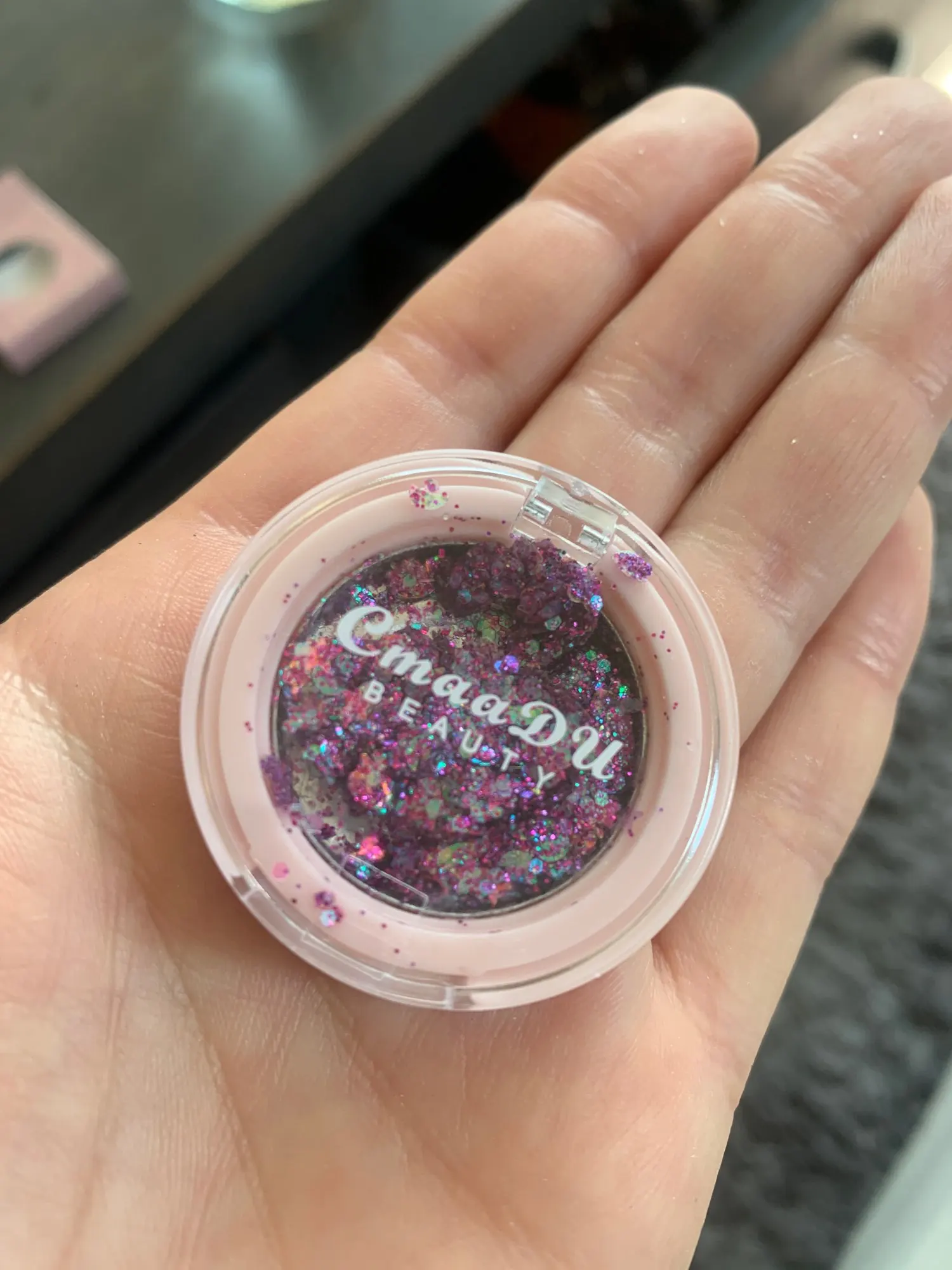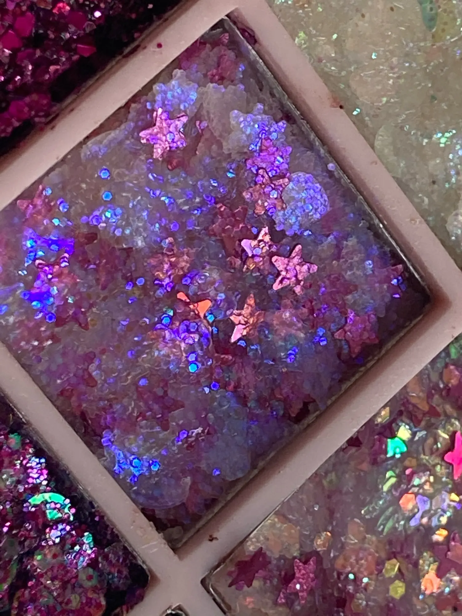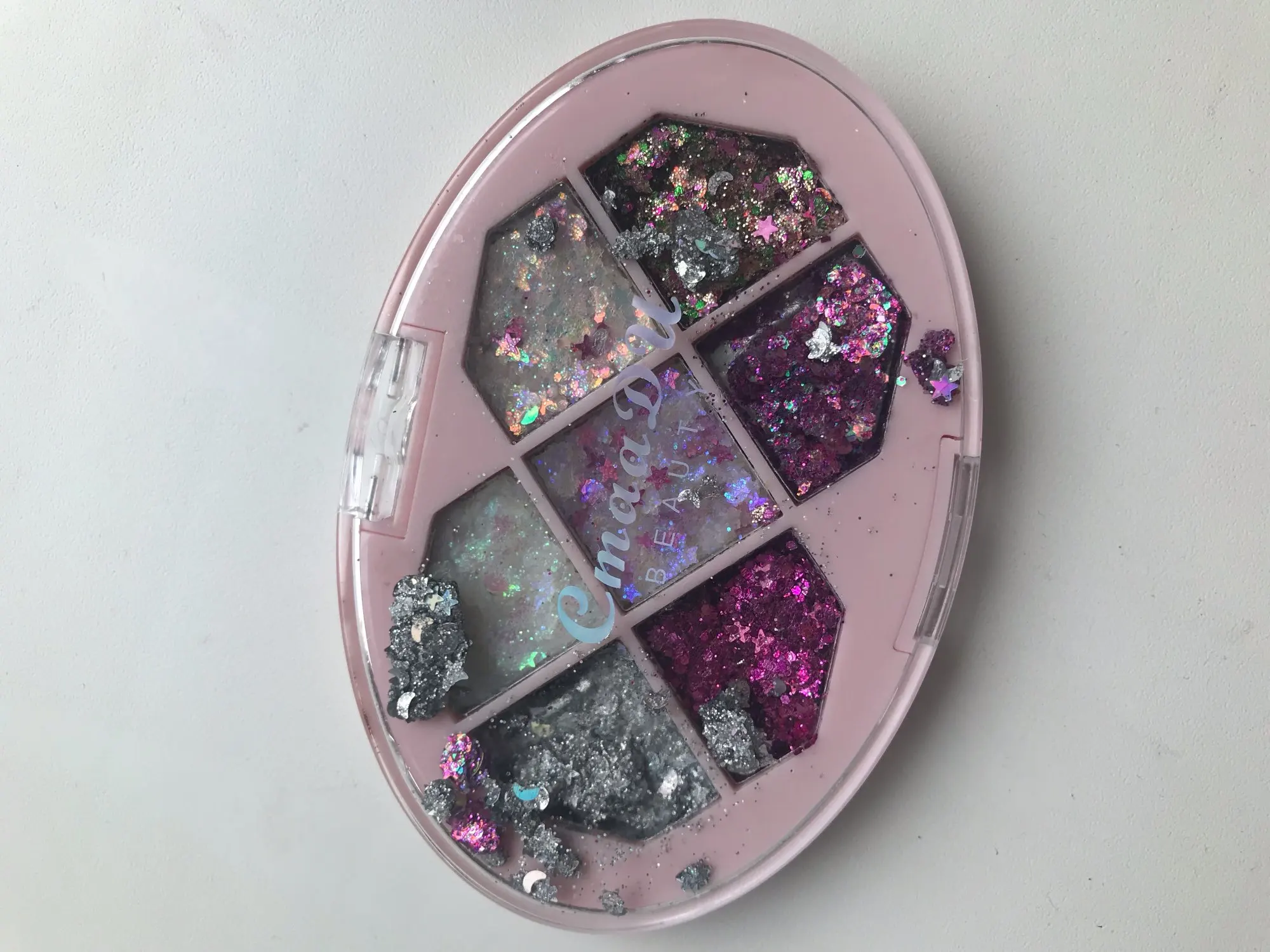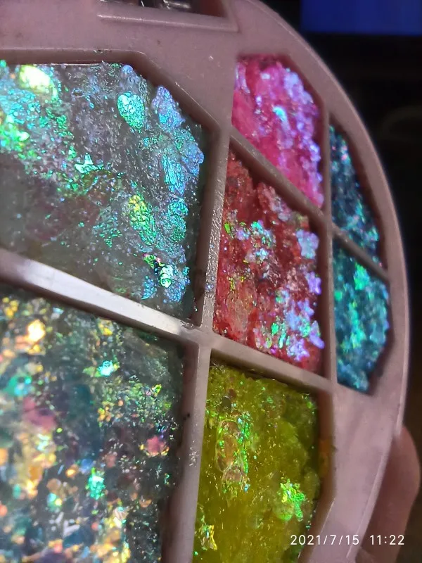 Блёстки доставили вот в таком виде.. Нескорые части были рассыпаны по соседним ячейкам. Сначала мне показалось будто они вообще сухие, не с гелем.. но на руку нанесла нормально и даже еле отмыла потом. 4/5 только за то, что не спрессованные были. Видимо надо больше геля для стойкости