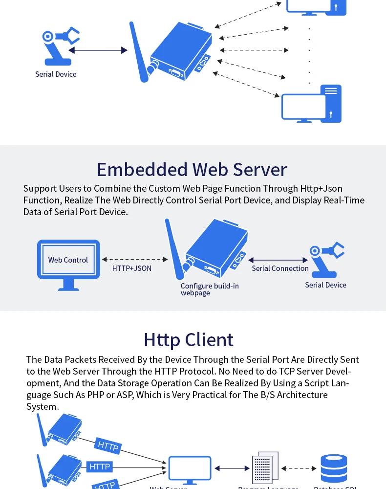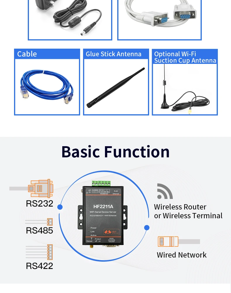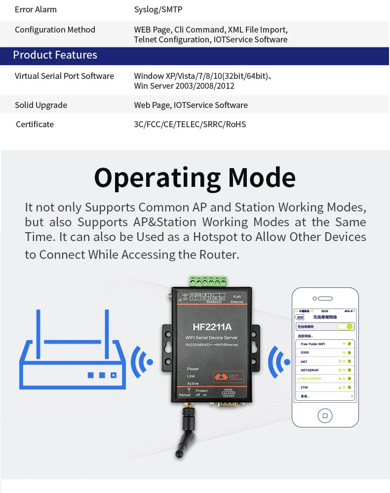 HF2211A-это Последовательный RS232/RS485/RS422 к WiFi/Ethernet-серверу, используемый для прозрачной передачи данных. HF2211A-это недорогой сервер последовательных устройств, функция которого заключается в реализации двунаправленной прозрачной передачи между RS232/RS485/RS422 и WiFi/Ethernet.