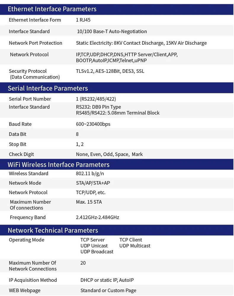 Обзор характеристикиMIPSMCU с 4 Мб флэш-памяти и 8 Мб SRAM. Запуск на eCosПоддержка TCP/IP/Telnet /Modbus TCPProtocolПоддержка RS232/RS422/RS485 для преобразования Ethernet/Wi-Fi, последовательная скорость до 460800 bpsПоддержка режима STA/AP + STAПоддержка маршрутизатора или мостового сетевого режима работы.Поддержка 10/100M Ethernet автоматического согласованияПоддержка легкого конфигурирования веб-интерфейса или ПК IOTManagerПоддержка протоколов безопасности, таких как assl/AES/DES3Поддержка веб-обновления OTA WirelssВход WideDC 5 ~ 36VDC или 9 ~ 50VDCРазмер: 95x65x25 мм (Lx W x H)FCC/CE/RoHSCertificated