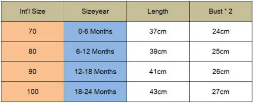 Размеры Рекомендуемый возраст Размер (см) Комбинезон Длина Размер бюста * 2 70 Для детей от 0 до 6 месяцев 37 24 80 6-12 месяцев 39 25 90 12-18 месяцев 42 27 100 18-24 месяцев 45 29 Разница в 2-3% в соответствии с измерениями вручную. Прежде чем купить эту товарную позицию, просим тщательно свериться с таблицей размеров. 1 дюйм = 2,54 см Обратите внимание что небольшая разница в цвете считается приемлемой. Это может быть связано с положением источника света и с настройками экрана.Предварительный просмотр