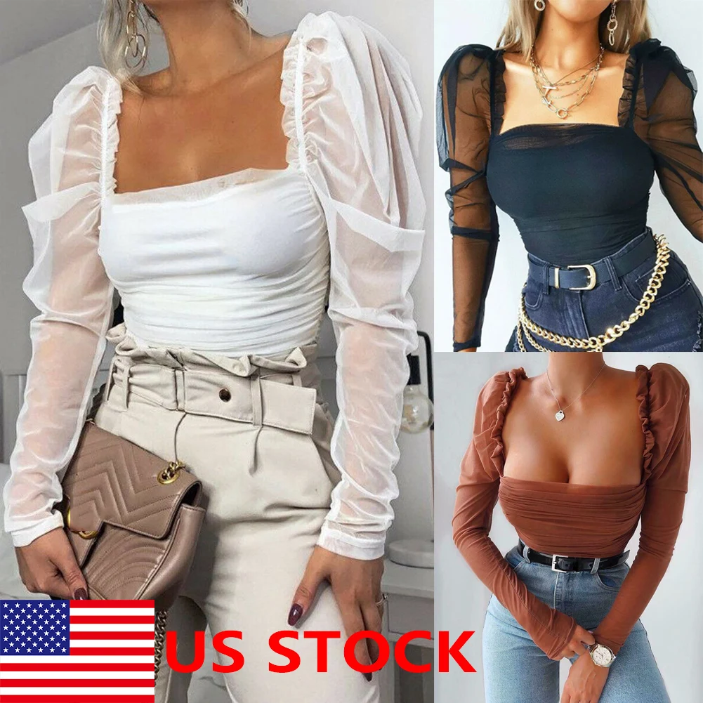 Модные сексуальные женские топы и блузки, элегантная сетчатая бандажная Блузка с оборками и длинным рукавом, женская вечерняя Клубная уличная одежда для вечерние