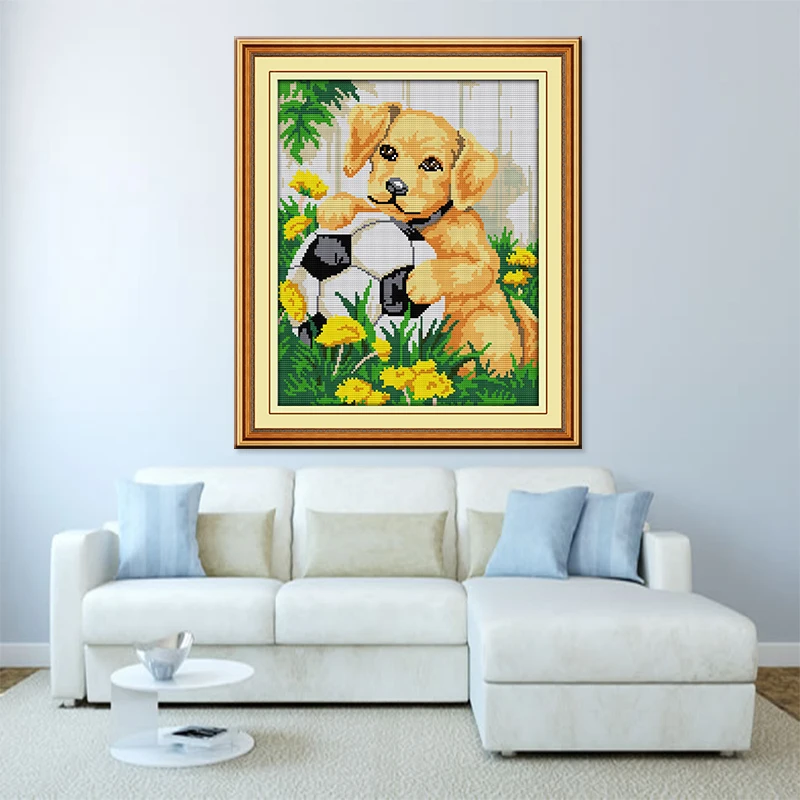 Набор для вышивки с щенком и футболом Joy Sunday, Набор для вышивки крестиком 11 и 14 карат