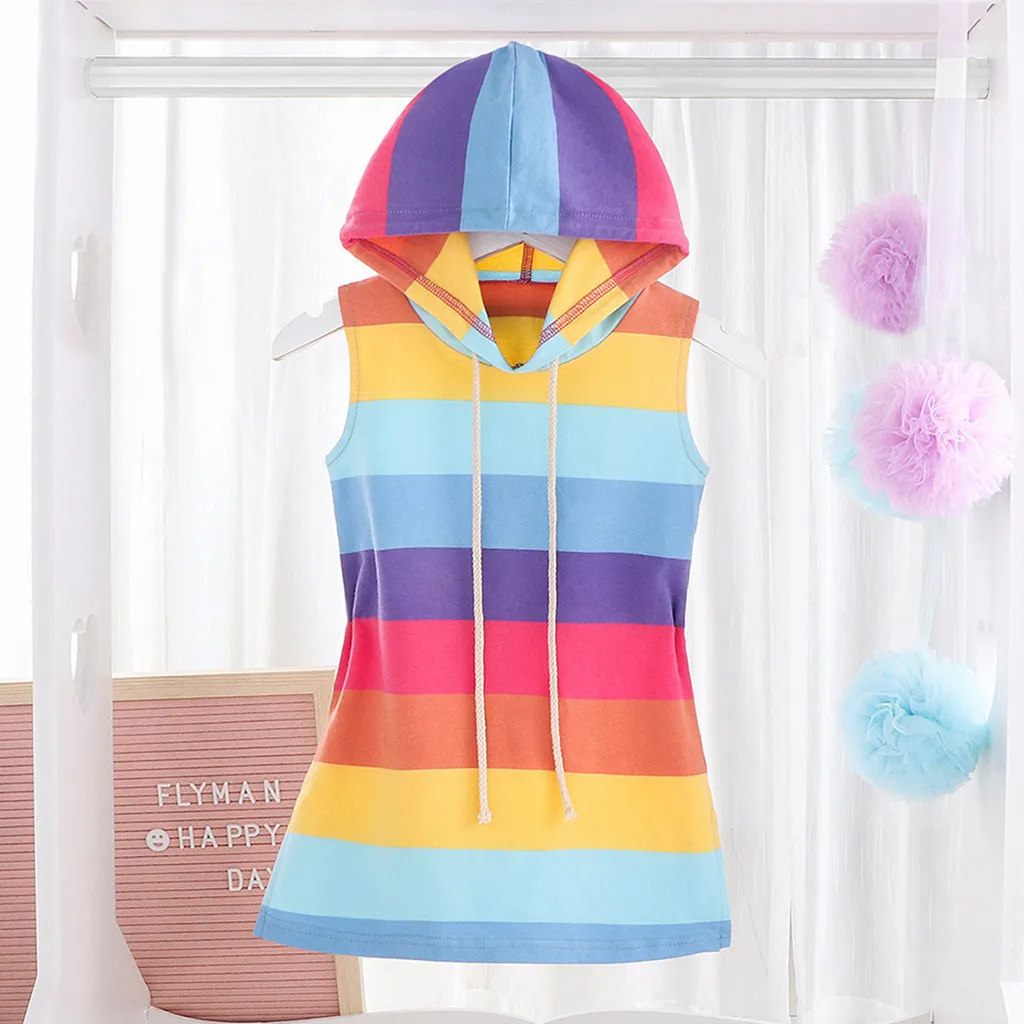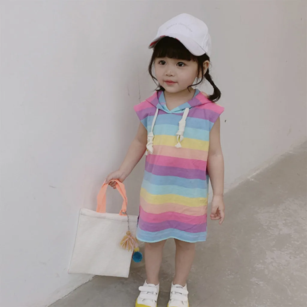 Летняя одежда для детей ясельного возраста детская одежда для девочек платье с короткими рукавами в радужную полоску с капюшоном свободное платье принцессы вечерние пляжные спортивные платье Повседневная одежда для детей # p4