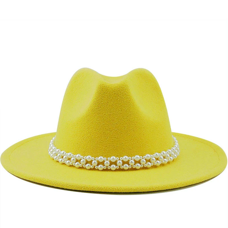 Шляпа Женская фетровая с лентой и жемчугом, элегантная шерстяная шляпа джентльмена и леди с широкими полями, сомбреро, джазовая Кепка для девушек, зима-осень