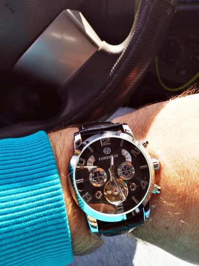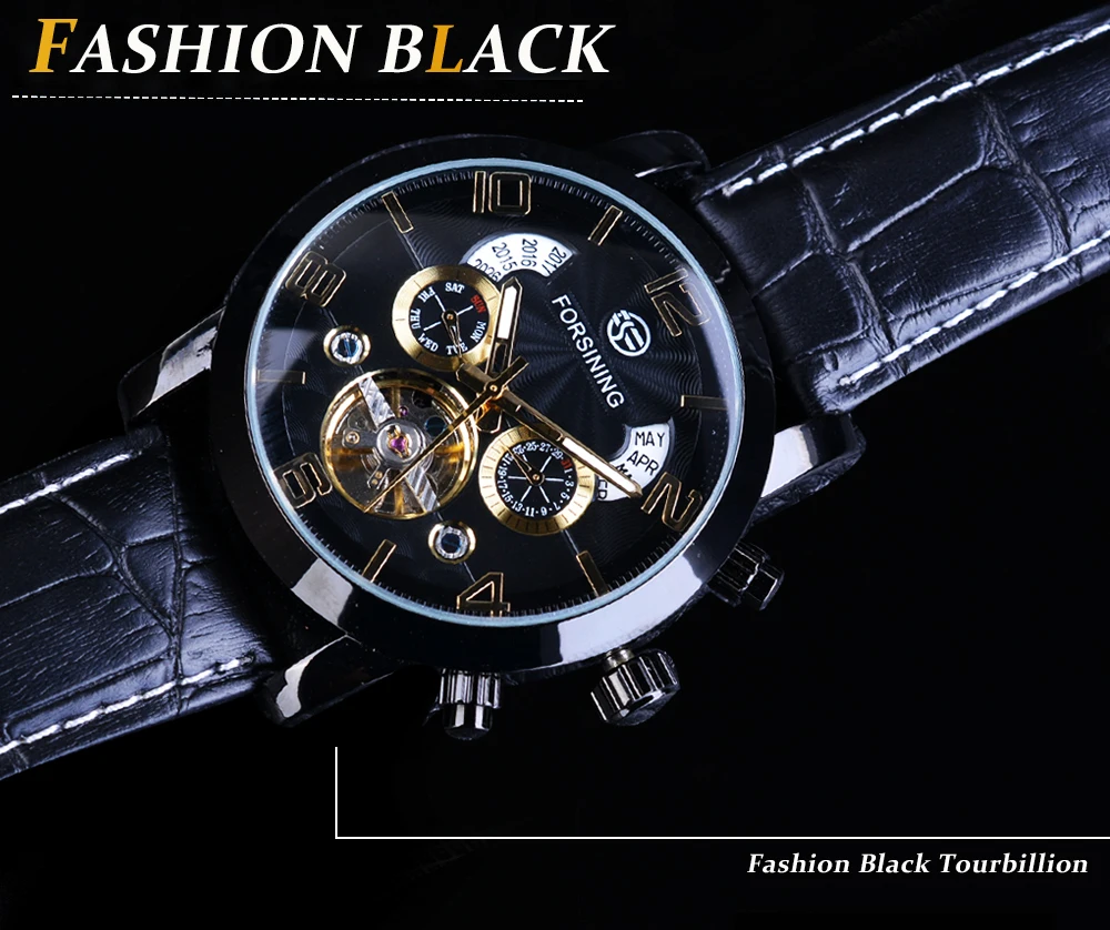 Часы наручные Forsining Мужские механические, модные многофункциональные автоматические, с волнообразным циферблатом, чёрные и золотые