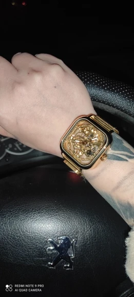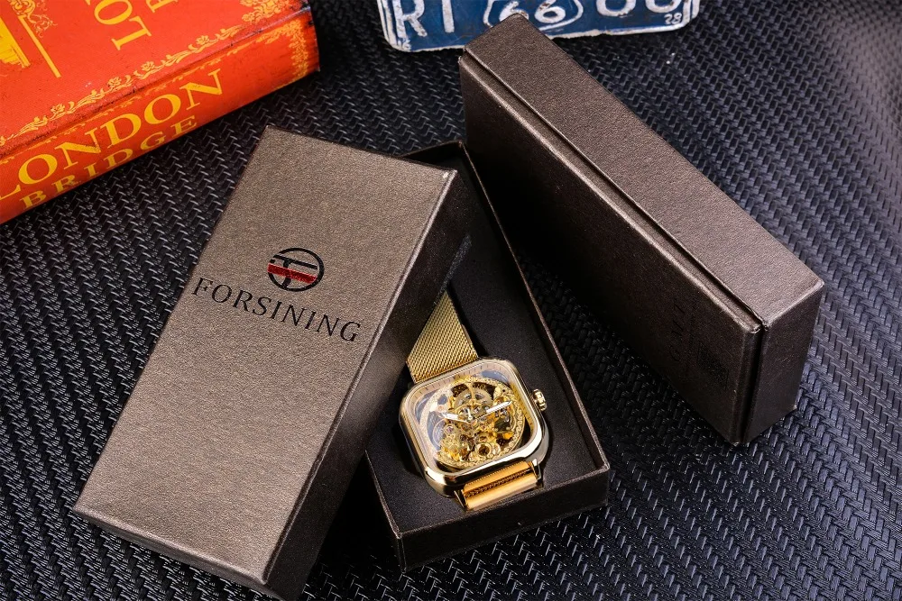 Часы наручные Forsining Мужские механические, модные автоматические золотистые прозрачные часы-скелетоны с автоподзаводом, с сетчатым стальным браслетом