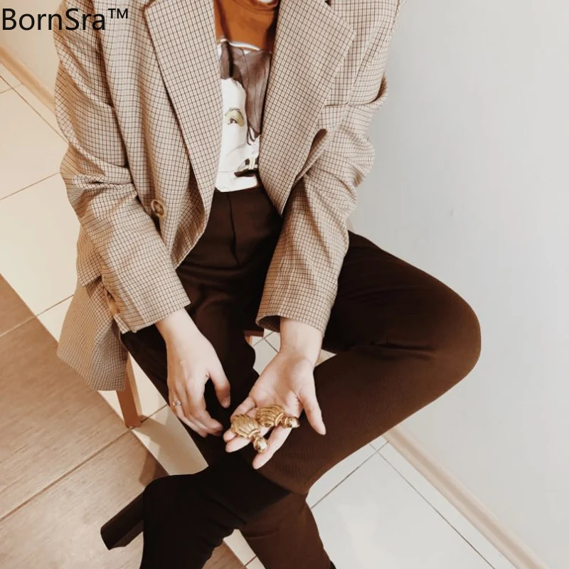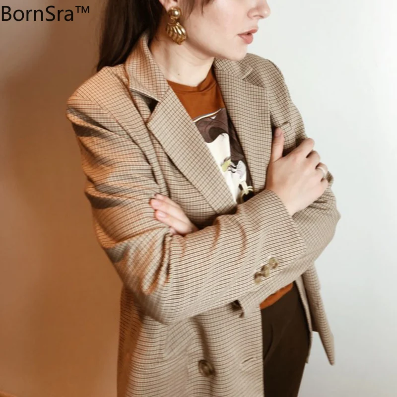 BornSra Классический Клетчатый двубортный женский пиджак блейзер с английским воротником женские костюмы пальто Модная твидовая лапка осень 2019