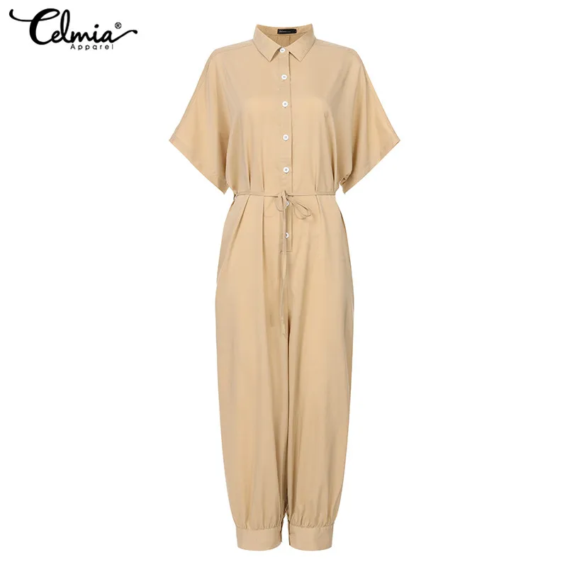 Celmia женские комбинезоны 2021 летние комбинезоны с короткими рукавами, повседневные свободные Кнопки карго штаны размера плюс, однотонные штаны-шаровары брюки; Комбинезоны