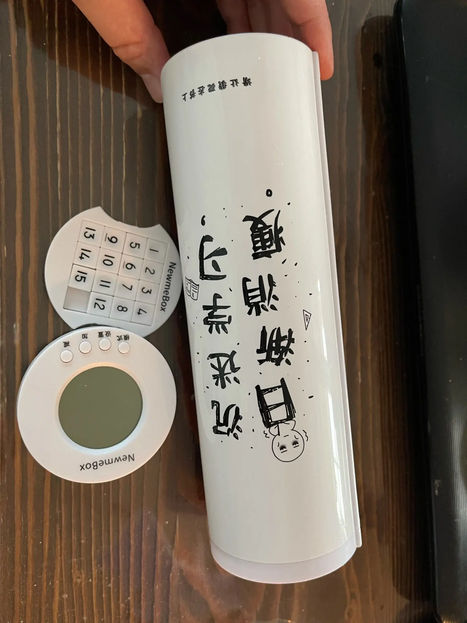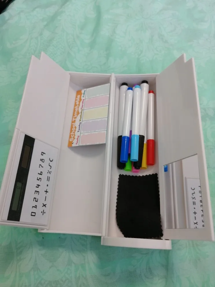 Он поставляется со всем, маркеры записывают и стирают гладкий, и закрывается магнитами. Я люблю свою. Вы можете поместить только игра-головоломка и часы в слот вверху за раз. Я почти уверен, по крайней мере, lol