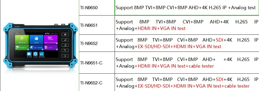 ● 5 дюймов IPS сенсорный экран, 1920x1080 Разрешение● Тест камеры 8MP CVI/ TVI/ AHD● 8MP EX-SDI, HD-SDI, 3G-SDI Тест камеры *● H.265/H.264, 4K видео дисплей через мейнстрим● Вход VGA, поддержка 2048x1152 60 кадров в секунду *● HDMI вход, поддержка 4K 30FPS *● DC12V 3A, 48V PoE выходная мощность● Быстрый ONVIF, создайте протокол тестирования и измените ip-адрес и т. д.● Автоматическое HD, автоматическое распознавание HD коаксиального типа камеры и разрешение● Тест кабеля RJ45 TDR, проверка качества кабеля● Проверка кабеля UTP, обнаружение точки сбоя ближнего, среднего и дальнего концаКристаллическая головка сетевого кабеля