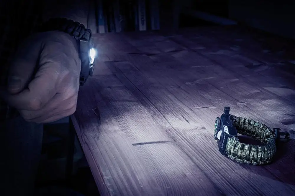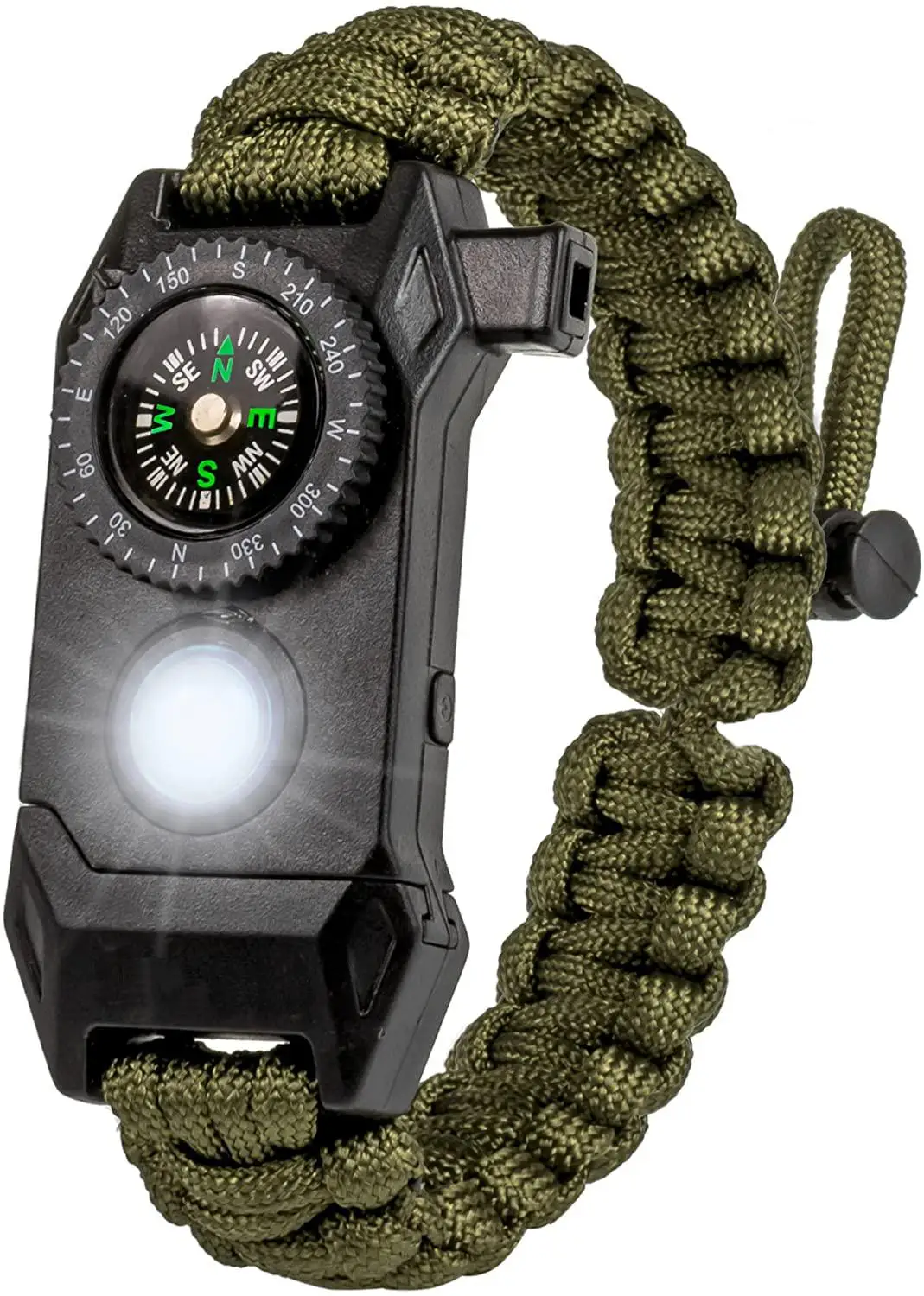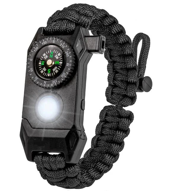 Тип изделия: Браслет Из паракорда для выживания Длина: 25*3,2 см Материал: 7-жильный Паракорд Особенности: компас, термометр, свисток светодиодный светодиодные фонари.