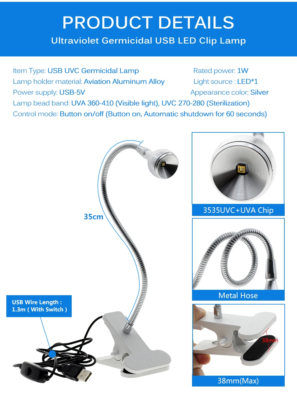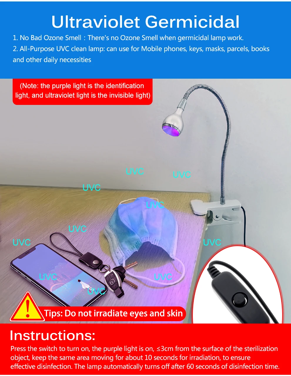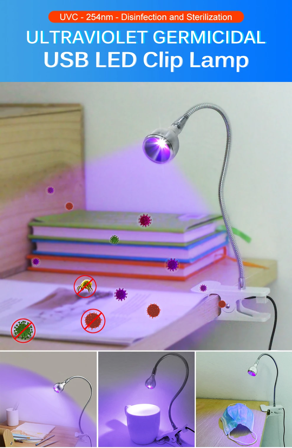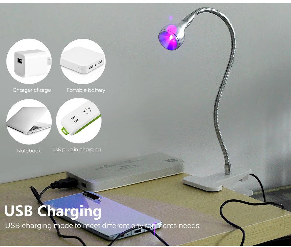 Бактерицидная лампа UVC, регулируемый дезинфекционный светильник для посылок, масок, книг, клещей с чистым воздухом и держателем на зажиме, USB, 5 В