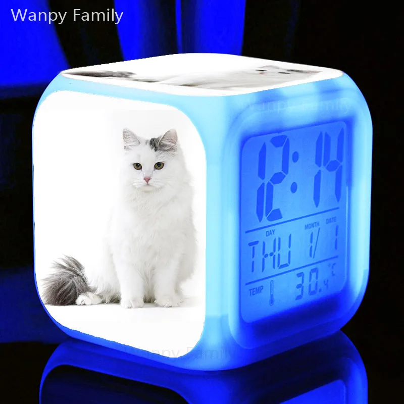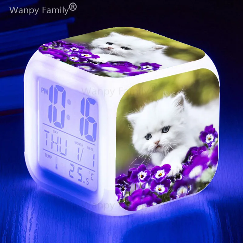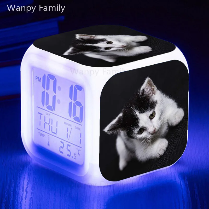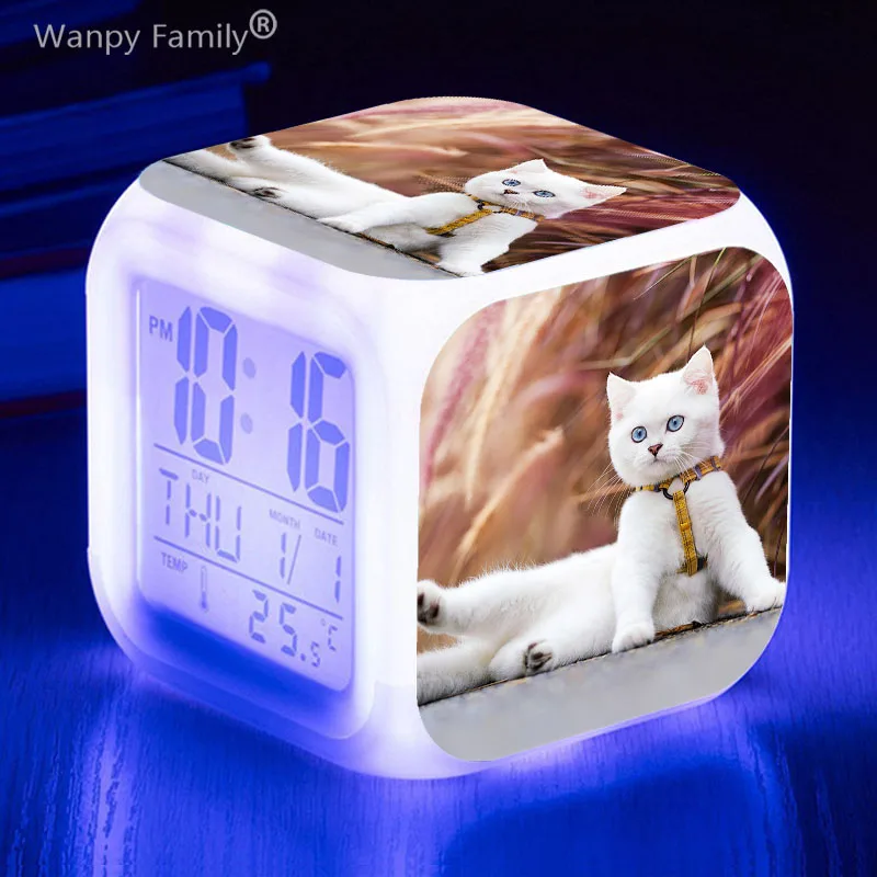 Милый белый Ktten, кот, светодиодный Будильник, 7 цветов, светящиес...
