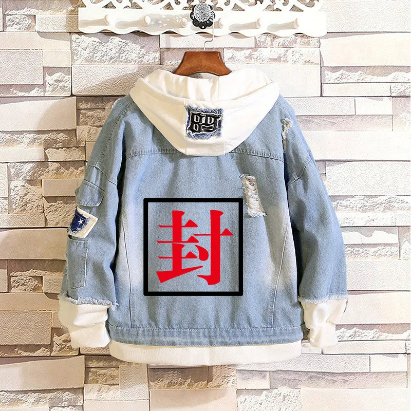 Джинсовая куртка, рваная куртка с капюшоном, в шнуровке, Jibaku Sho...