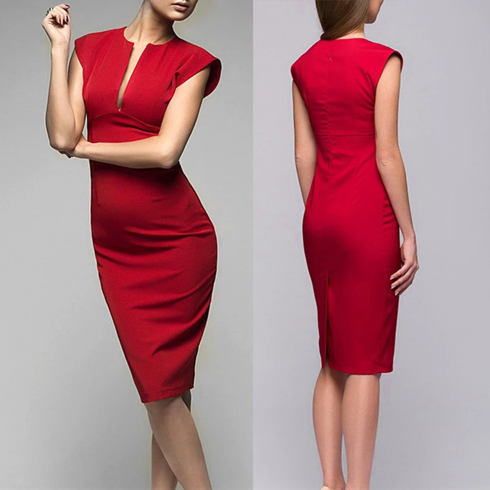 Женские вечерние Клубные сексуальные тонкие Bodycon Глубокий V воротник сплошной цвет юбка-карандаш, платье