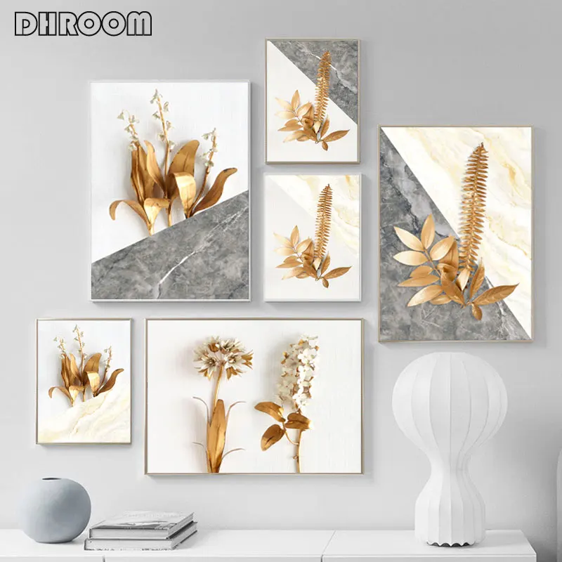 Постер на холсте с золотыми листьями, настенный художественный принт с цветами, Скандинавская декоративная картина, современный декор для гостиной