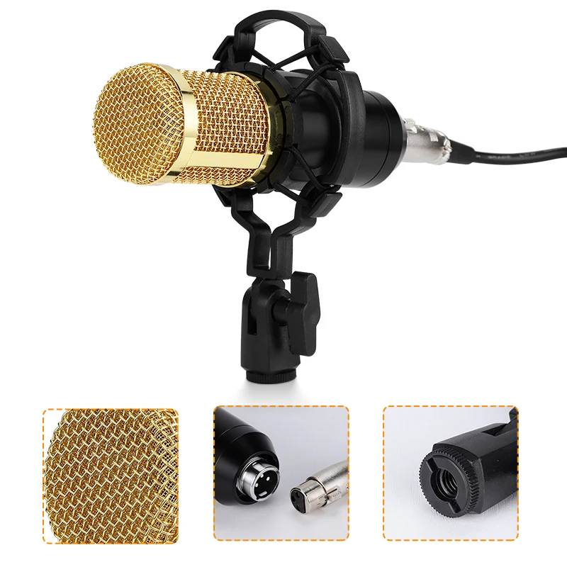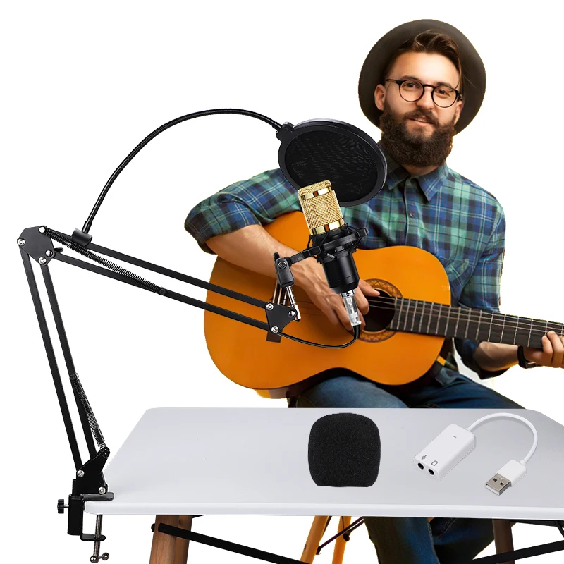 1 X золотистое цинковый сплав микрофон 16*4,5 см 1 X Черный Анти-спрей net 15,5 см 1 X белая звуковая карта USB 1 х Черная пластиковая ударная рама 1 х черный микрофон ветрозащитный хлопок 1 X черный зажим 1 х черный железный зажим 1 X Черный аудио кабель 2,5 м 1 черный Кронштейн 38*37 см Руководство пользователя на английском языке-1 шт.
