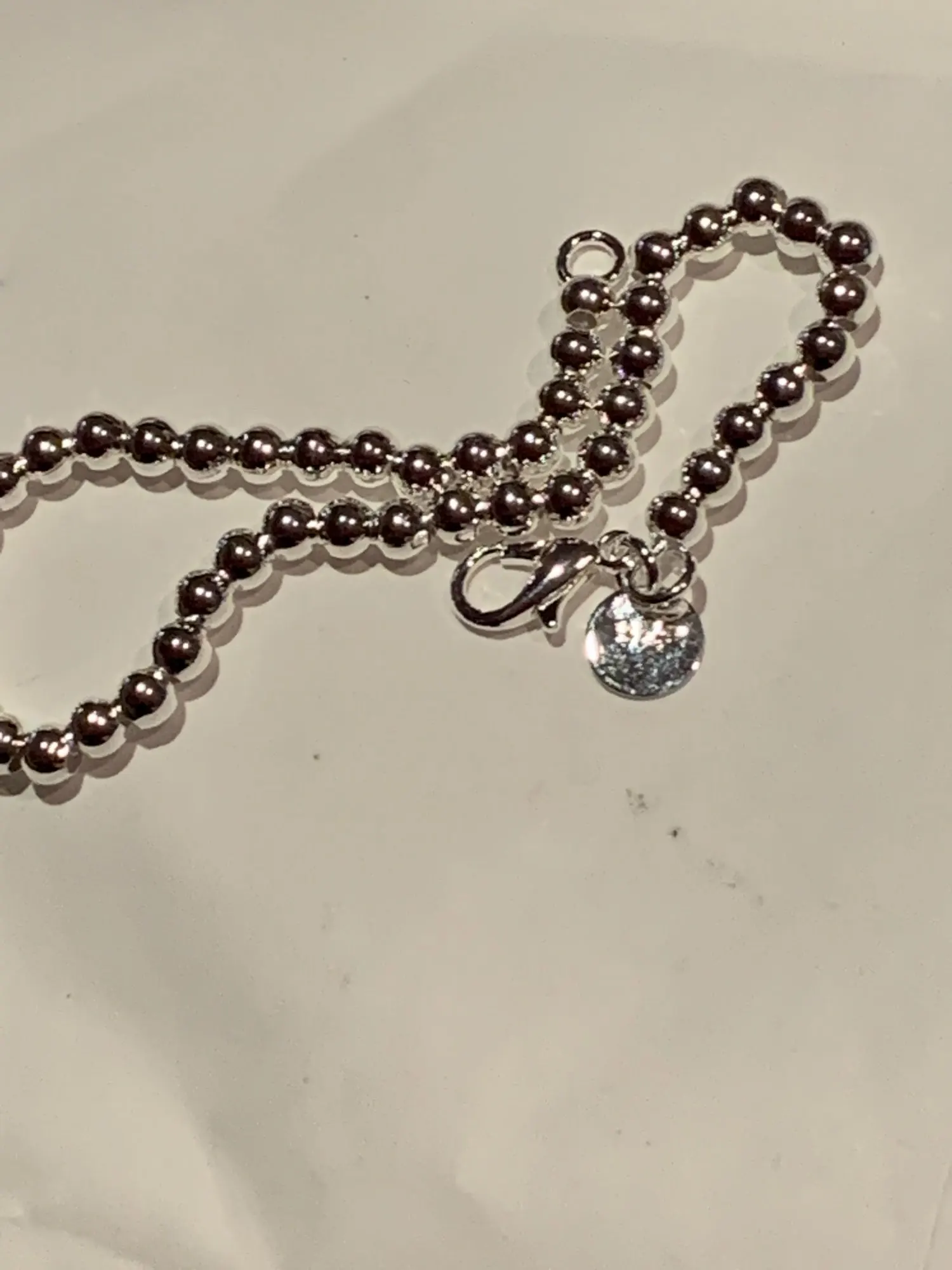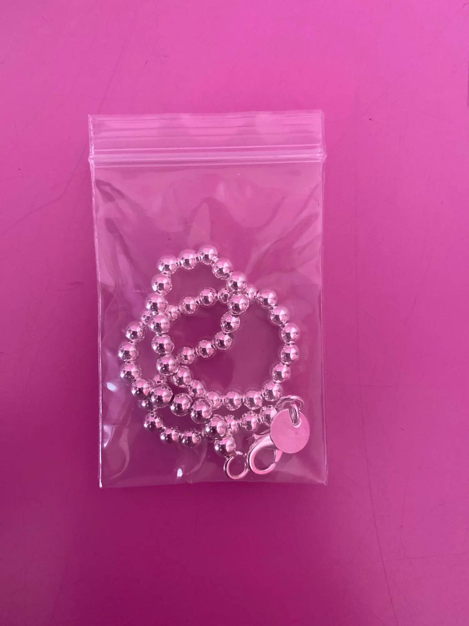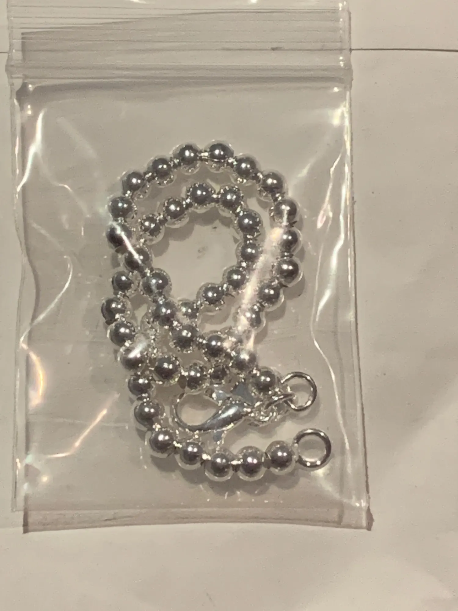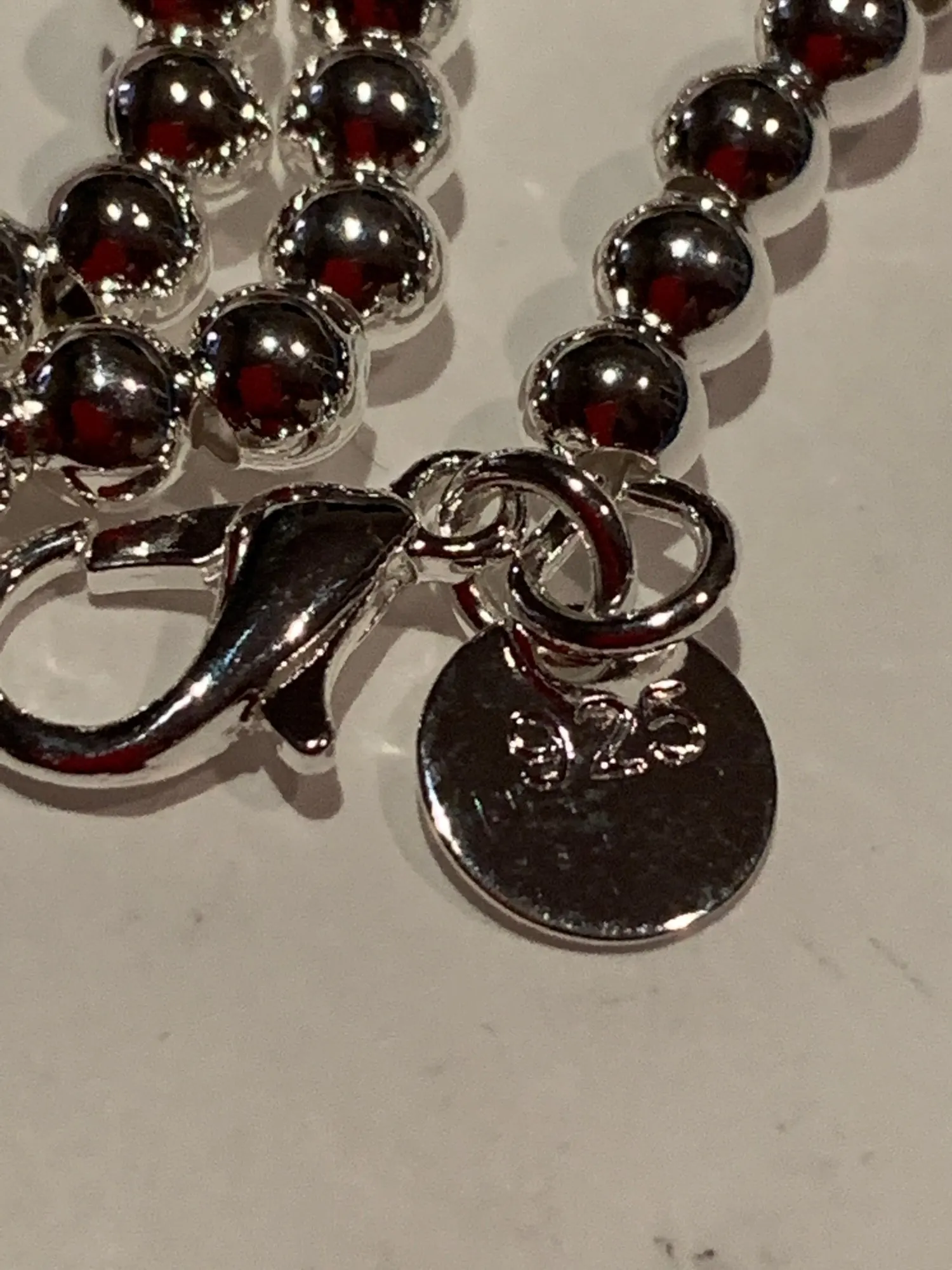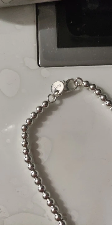 выглядит как пластмассовые бусы на ёлку. на серебро не похоже. но к описанию претензий нет, эту вещь просто надо увидеть и будет понятно,что это не серебряное изделие.