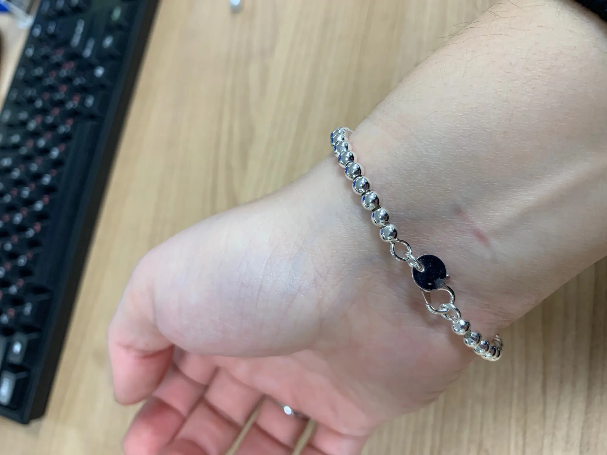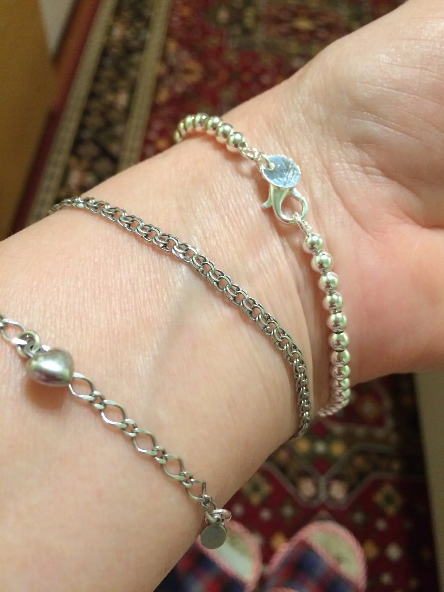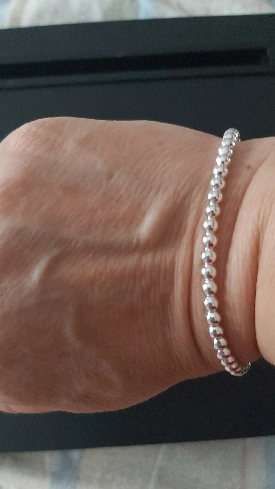 Посылки объединили в одну, поэтому приехал быстро, буквально две недели. На мою кисть руки велик. Думаю, как можно уменьшить. Пока вариантов нет, потому что там идёт металлическая основа, на которую надеты эти бусины, а концы припаяны. Похоже, носить не смогу, а жаль. Выглядит красиво.