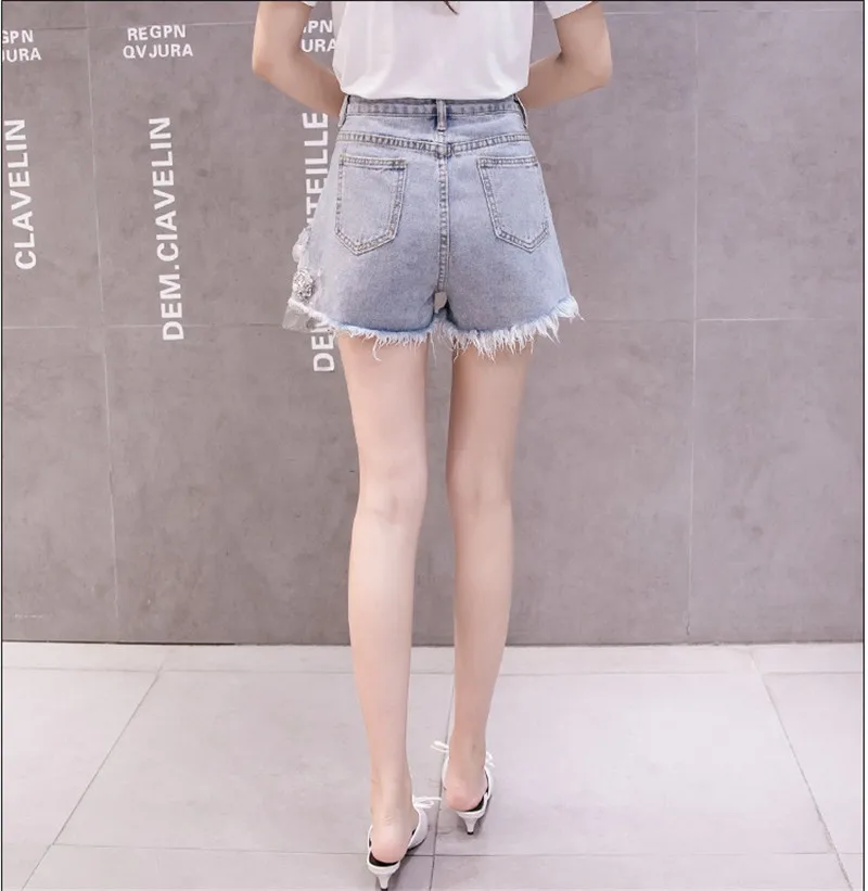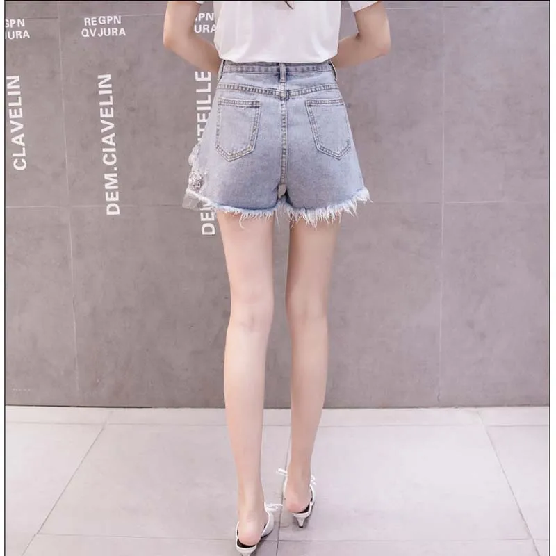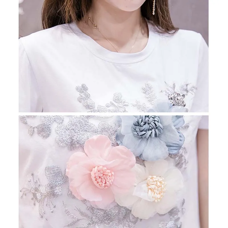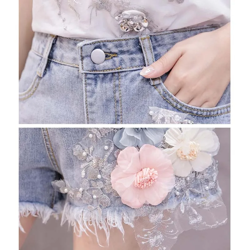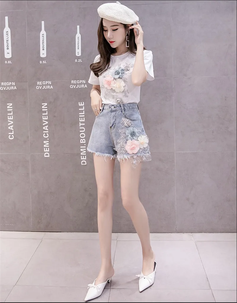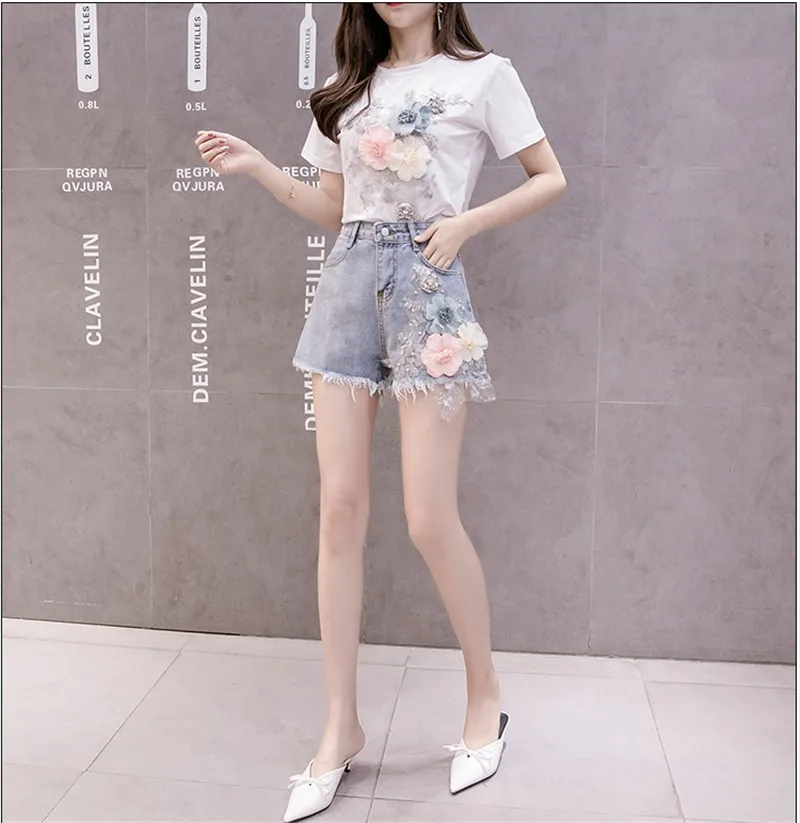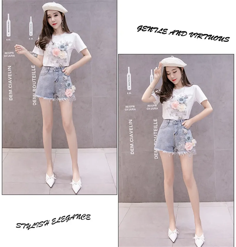 Комплект из двух предметов Женский Повседневный, модная футболка с коротким рукавом и рваные джинсовые шорты с вышивкой 3D цветов, лето